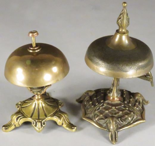 Two Brass Store Bells. Antique brass has elephant motif. Both in good working condition. Tallest measures 6 1/2 inches tall.