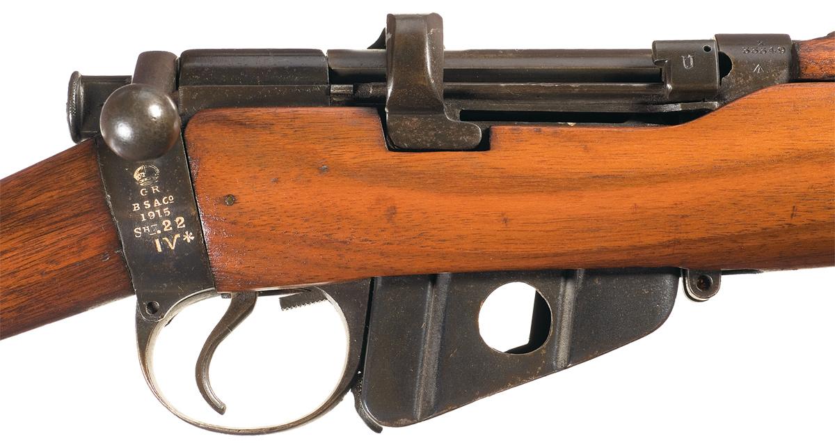 A) The top of the barrel at the breech is marked with three stacked rifles over "BSA", the left side of the front receiver ring is marked "crown / GR / crossed scepters" and the right side with the serial number and a broad arrow. The right side of the receiver strap is marked "crown / GR / BSACo / 1915 / SHT.22 / IV*". Shrouded front sight, tangent rear sight graduated to 2,000 meters, bayonet lug and mounted with a semi pistol grip stock with full matching handguard with brass stock disk marked "P.L. BENTLEY.", brass buttplate with compartment, sling swivels and stacking swivel. The magazine has a cut away circle on the right side and three slots on the left.