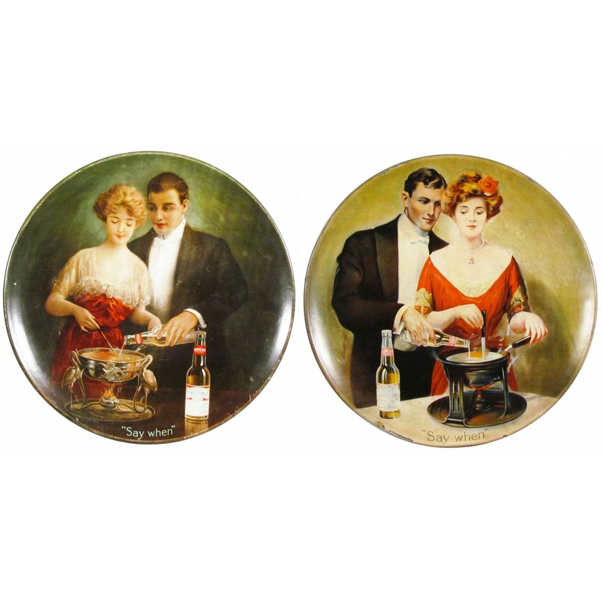 Two Budweiser Tin Chargers. Depicting a Man and Woman pouring "Bud" into chafing dish. Entitled, "Say When". Some minor edgewear to both otherwise very good condition. 16 inch diameter.