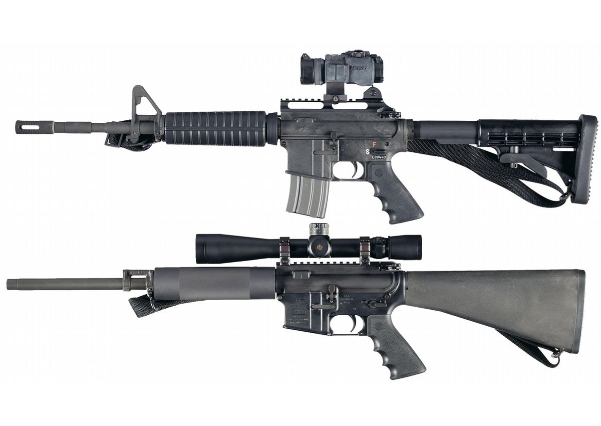 - B) The left side of the lower receiver has the standard markings and the top of the barrel is marked "B MP 5.56 NATO 1/9 H BAR". The front handguard is a checkered aluminum tube, Hogue rubber pistol grip and standard A2 style stock. M16A3 style upper, mounted with a Leupold Vari-X III 3.5-10x40mm TS sidefocus scope with Butler Creek flip up lens caps and a Leupold scope cover. With Eagle stock pack and black nylon sling.