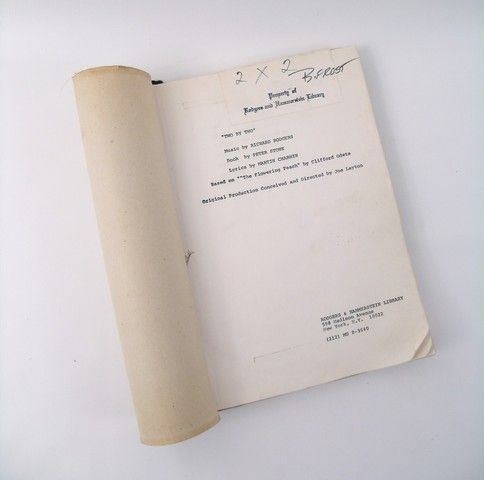 An extremely rare script for the Broadway musical "Two by Two" (1970) , with a book by Peter Stone, music by Richard Rodgers and lyrics by Martin Charnin. It was based on Clifford Odets's play "The Flowering Peach". It is the story of the great biblical flood, and of Noah's preparations for it. Noah was played by the legendary Danny Kaye. The musical became infamous for Kaye's throwing out large portions of the script and ad-libbing, which added to its box-office appeal as audiences came to see the play over and over again, just to see what Kaye would do next. Danny Kaye said his inspiration for this was watching Zero Mostel's nightly improvised performances on Broadway in "A Funny Thing Happened On The Way To The Forum". Original scripts for Broadway plays, especially musicals are rare and collectable.