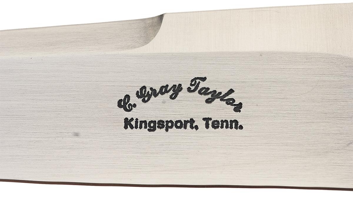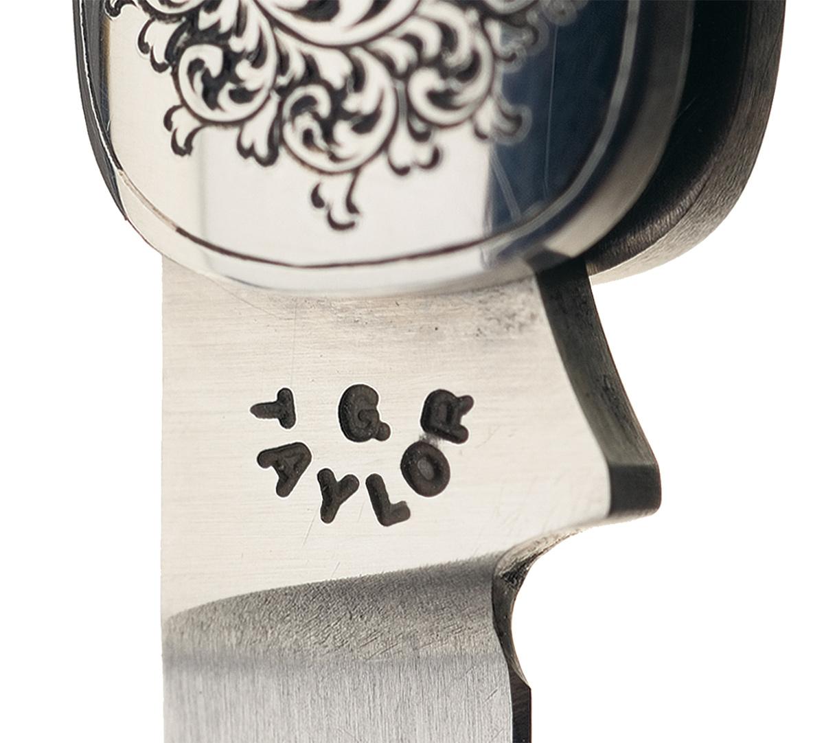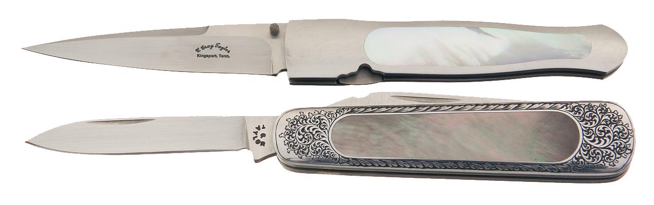 Both knives in this lot were fabricated by award winning knife maker C. Gray Taylor. 1) Folding knife with a 3 1/2 inch long blade marked "C. Gray Taylor / Kingsport, Tenn." Stainless steel frame with pearl inlays. OAL: 7 7/8" 2) Pocket knife with a fine scroll engraved frame with pearl inlays. The single edged blade is 1 1/2 inches long and marked "G. / TAYLOR". A folding file is also attached to the frame. OAL: 4" For the past 30 year Taylor has created art in the form of custom knives, and he is a member of the Art Knife Invitational, a prestigious group of 25 of the most collectible knifemakers in the world. Today, he specializes in reproductions of historical multi-blade gentleman folders.