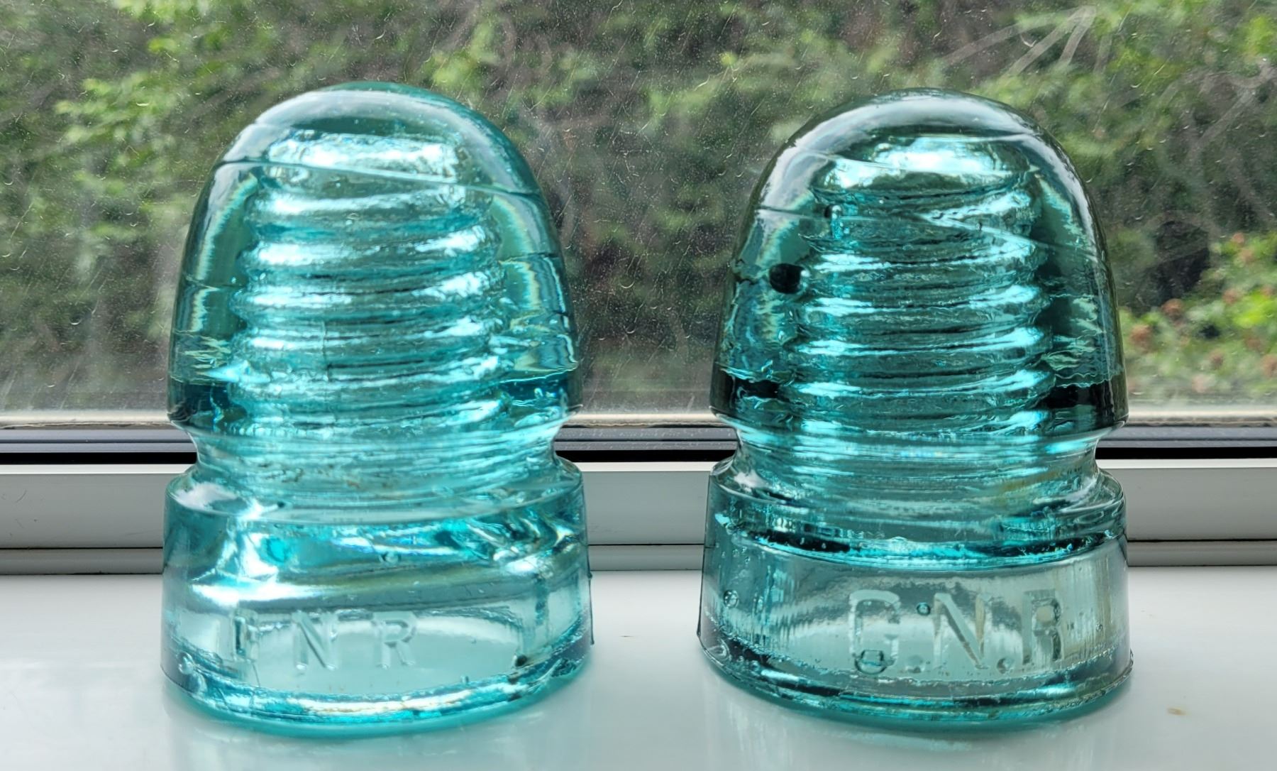 Two CNR turquoise glass insulators, one large print and one small print embossed on glass.