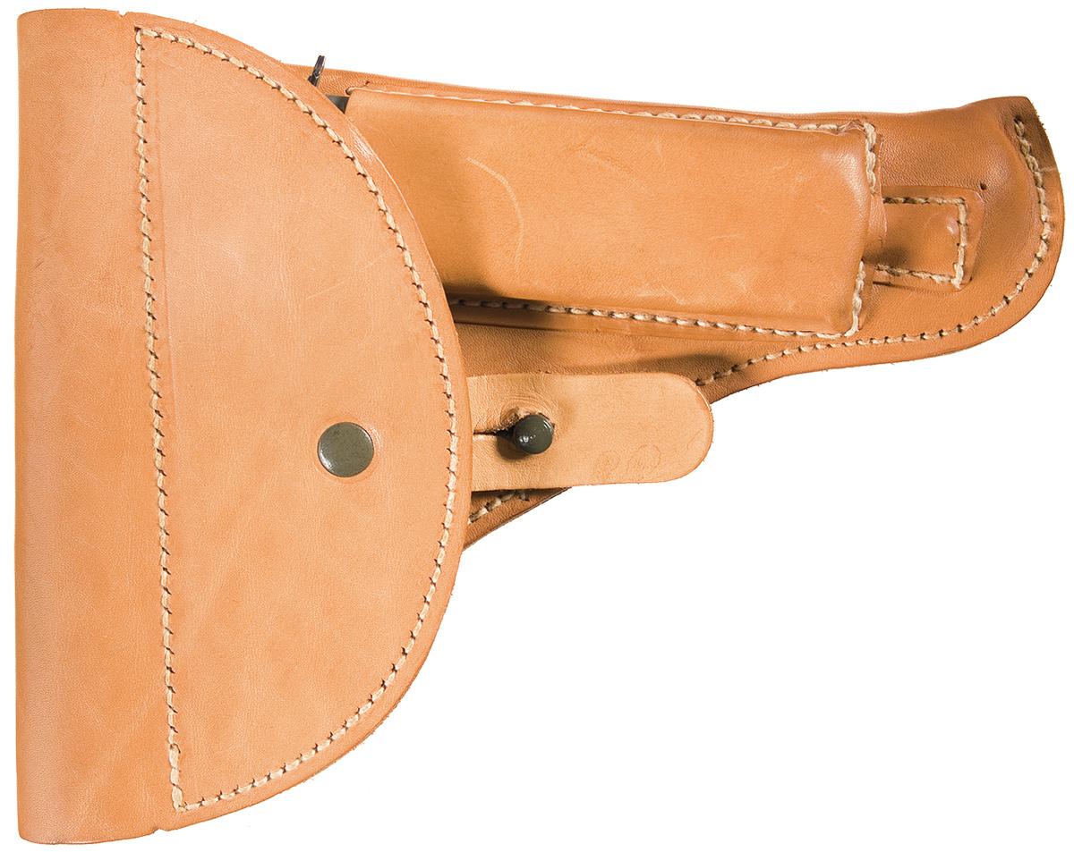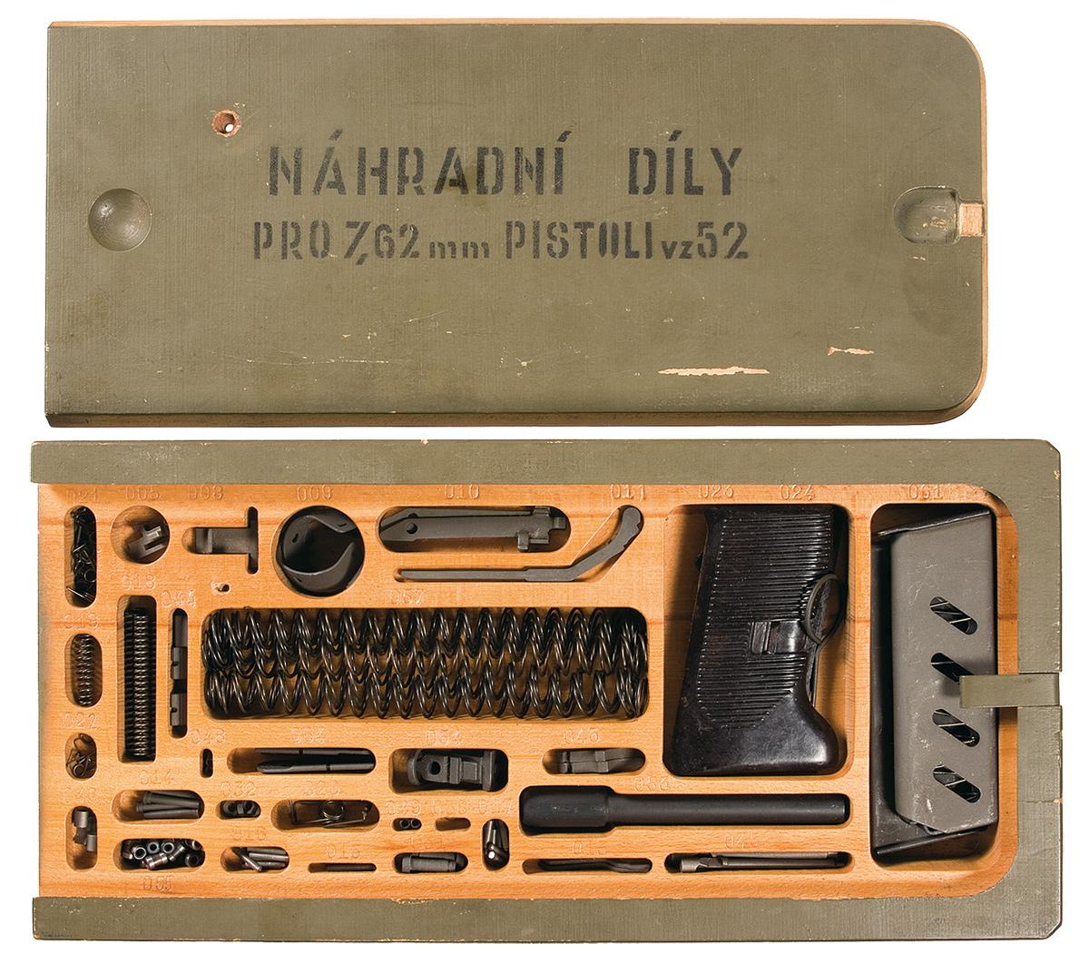A) Fixed sights, with the serial number on the left side of the frame and "(crossed swords) 54" on the reverse. Pistol is free of import marks. No import marks are visible. Matching numbers on the slide and barrel. Ribbed grips. With a brown leather holster dated 1989, extra magazine and a lanyard. The armorer kit comes in a green case, containing grips, magazines, an extra barrel and an assortment of small parts.