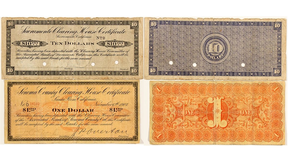 Sacramento Clearing House Certificate, $10, proof, unissued, cancelled with holes at signature site, good. Sonoma County Clearing House Certificate, $1, issued, uncancelled, vg - HKA#66336