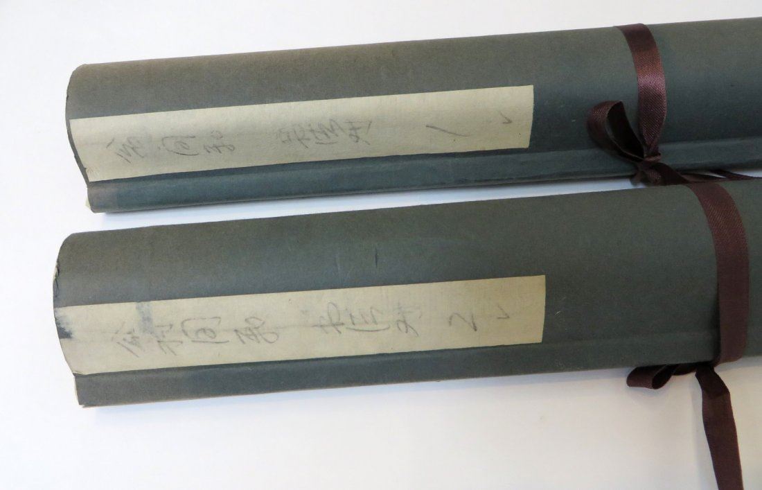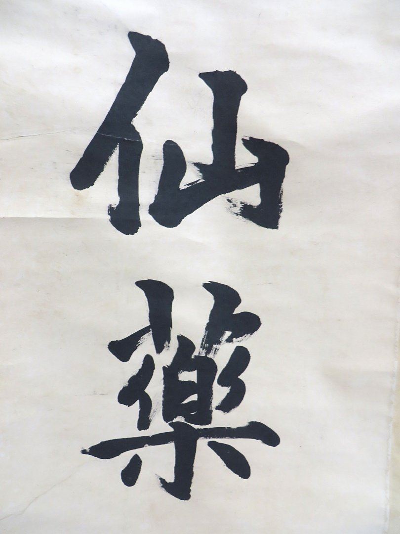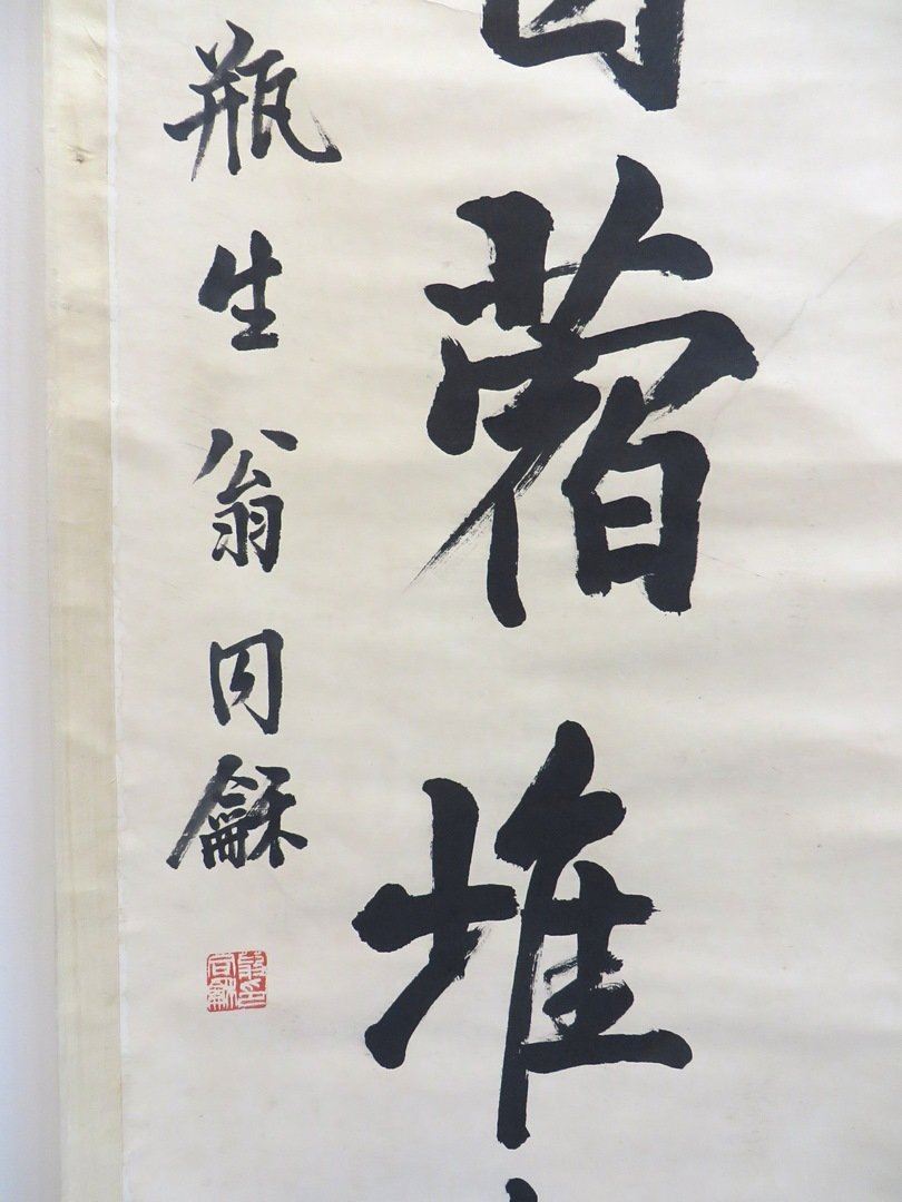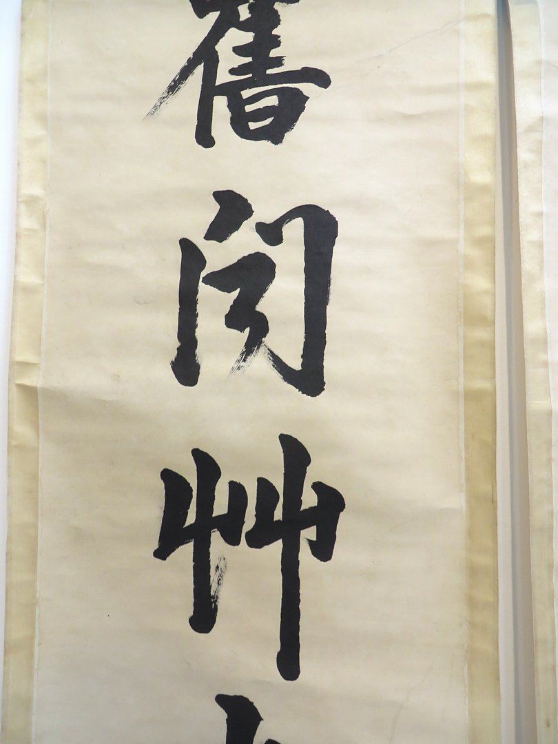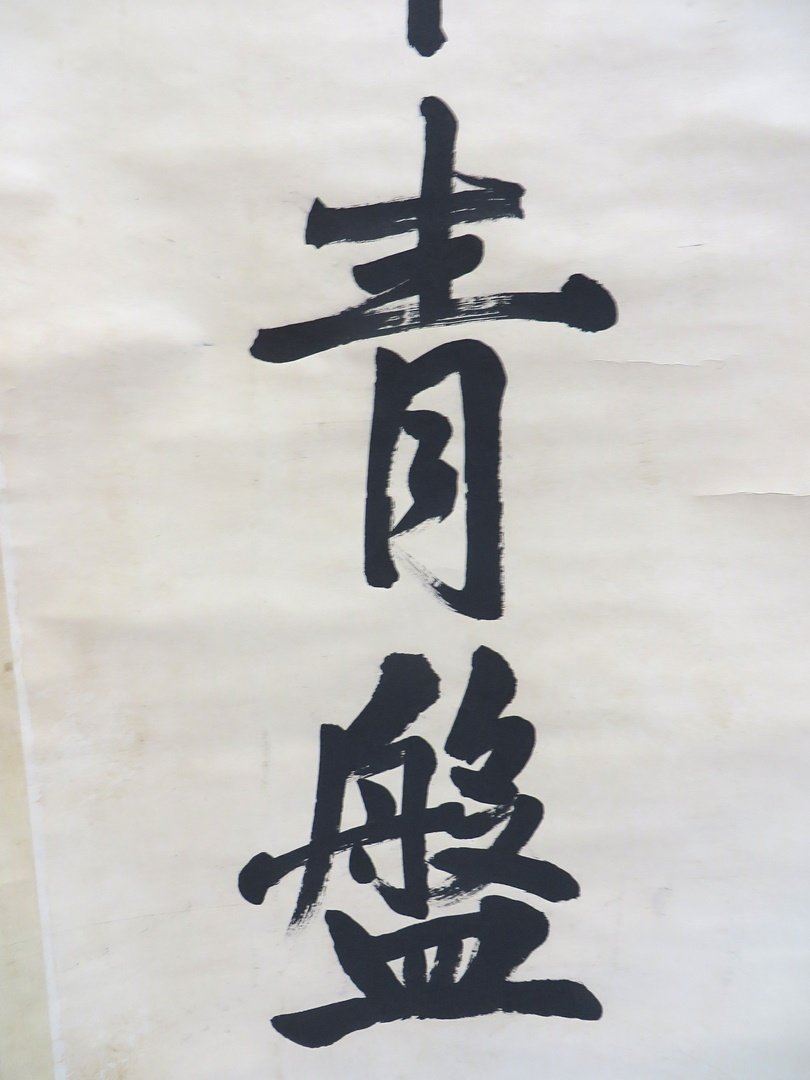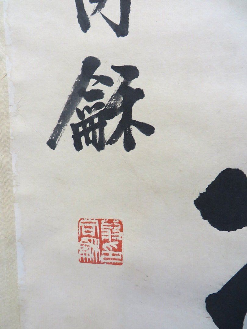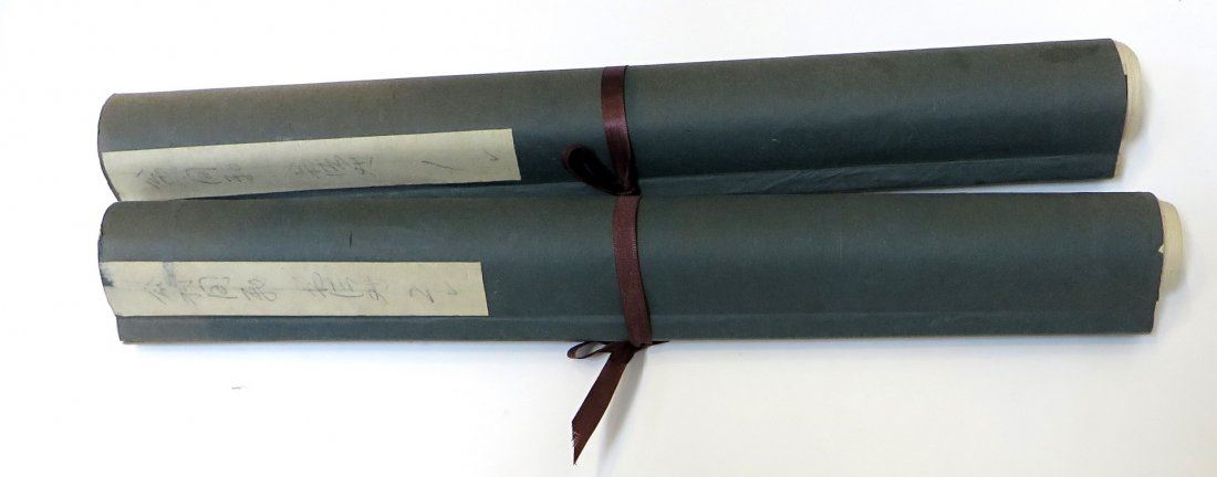 A pair of scroll depicting bold calligraphy. There is also the artist's signature in calligraphy and mark on the front. Calligraphy is also present on the back and easily visible when the scrolls are rolled up. Only 20 lots in this sale have reserves, marked with "R" at end of description.