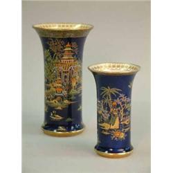 Two Carltonware trumpet vases, decorated with a pagoda 8in, and the Taj Mahal, 6in. £60-80