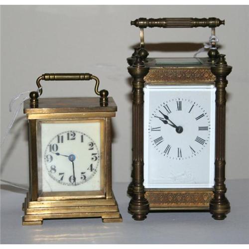 Carriage Clocks - Brass and Beveled Glass on all four sides.  Porcelain dial with Roman Numerals and minute ticks.  Measures 2 ½" x 3" x 6" T.  Second Clock -  Brass and beveled glass on sides.  Porcelain dial with small crack at bottom left.  Measures 3" W x 2" D x 3 ½" T.