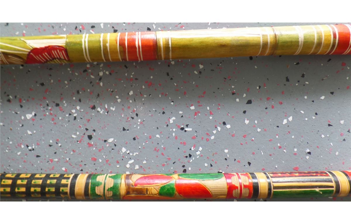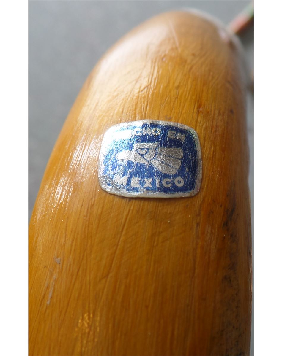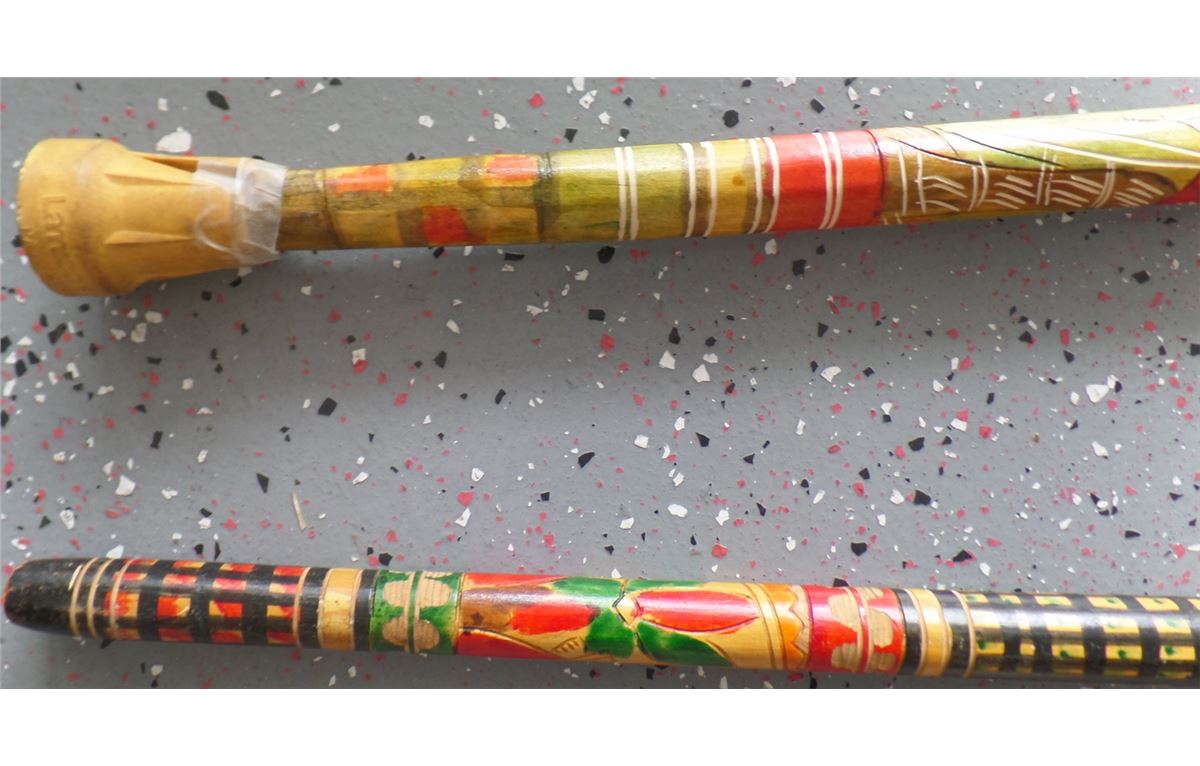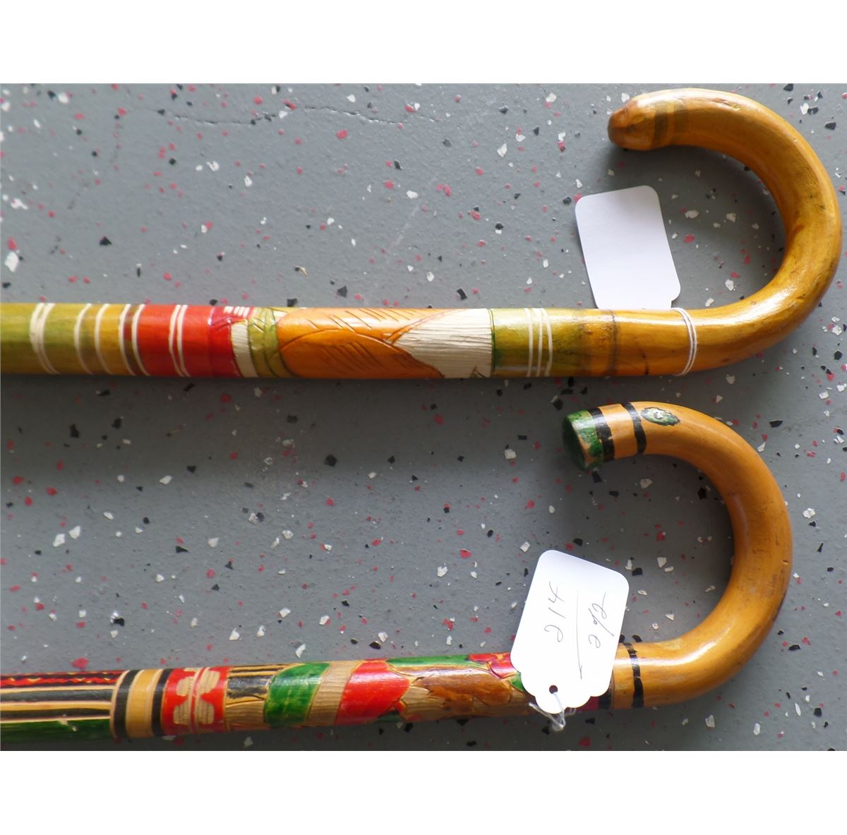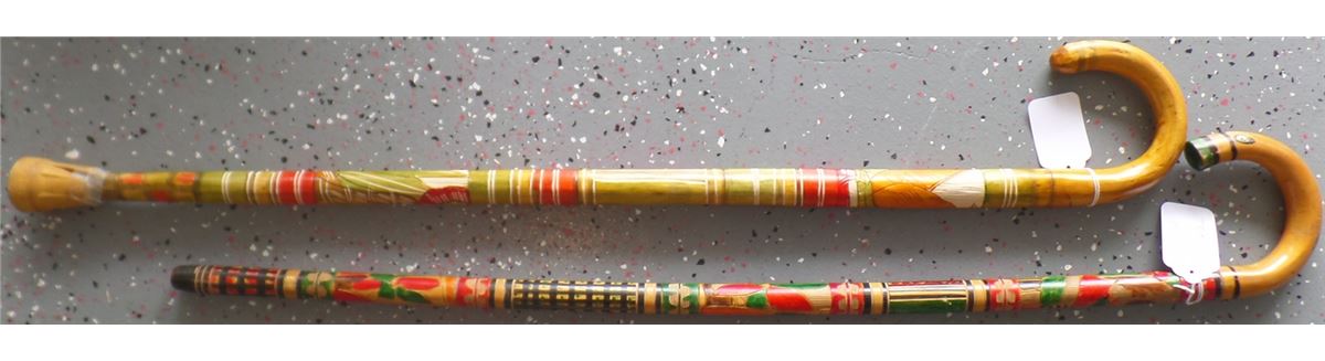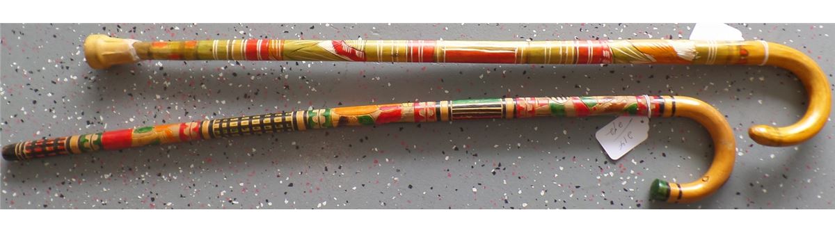 Great 1950's wood, paint and rubber Mexican Canes with carving and paintings. They measure 36x1 1/4 and 36 x 1 1/4 inches. Condition is very good, Shipping $20.00
