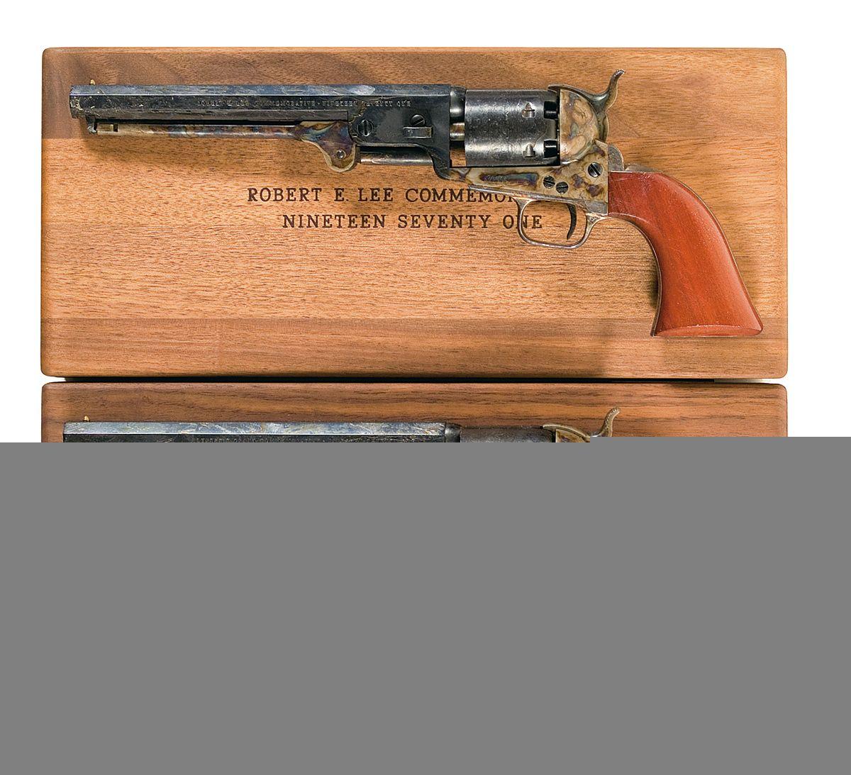 A) Standard commemorative markings and features with original grease dried on all metal surfaces. Complete with walnut case, original box numbered to gun, flask, bullet mold, Eley Bros caps container, nipple wrench and original shipping box.