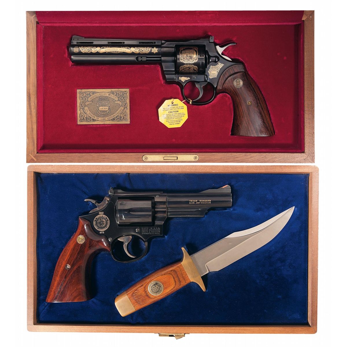 - B) Manufactured in 1973 with a fixed ramp front sight and adjustable rear sight. Standard markings and features. Fitted with hardwood grips with gold star medallions. With wooden case lined in blue velvet and a 6 inch blade knife.