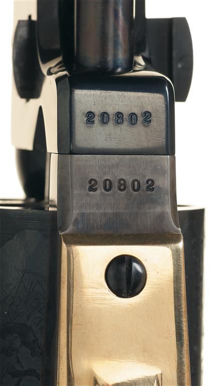 Excellent. The revolver retains 99% of the original blue finish with a few light handling marks and a light cylinder drag line. 99% of the case colors remain and the brass shows a few light handling marks and is slightly darkened with age. The grips are fine with a few light handling marks and a couple of pressure dents to the left panel.