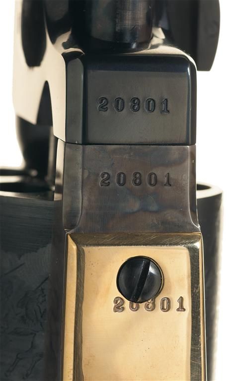 A) Approximately 25 were manufactured in 1974 starting with this serial number. Standard markings and features. Fitted with smooth walnut one piece grips. Complete with shared Colt wood display case, powder flask, bullet mold, cap tin and nipple wrench.