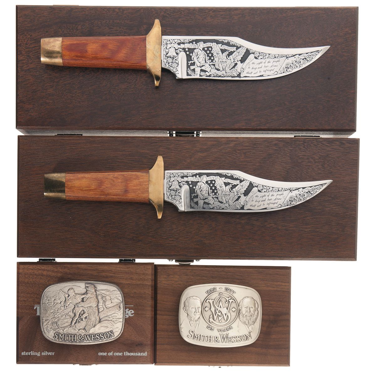 Lot includes two NRA/Bicentennial commemorative knives in cases and two cased Smith & Wesson belt buckles.