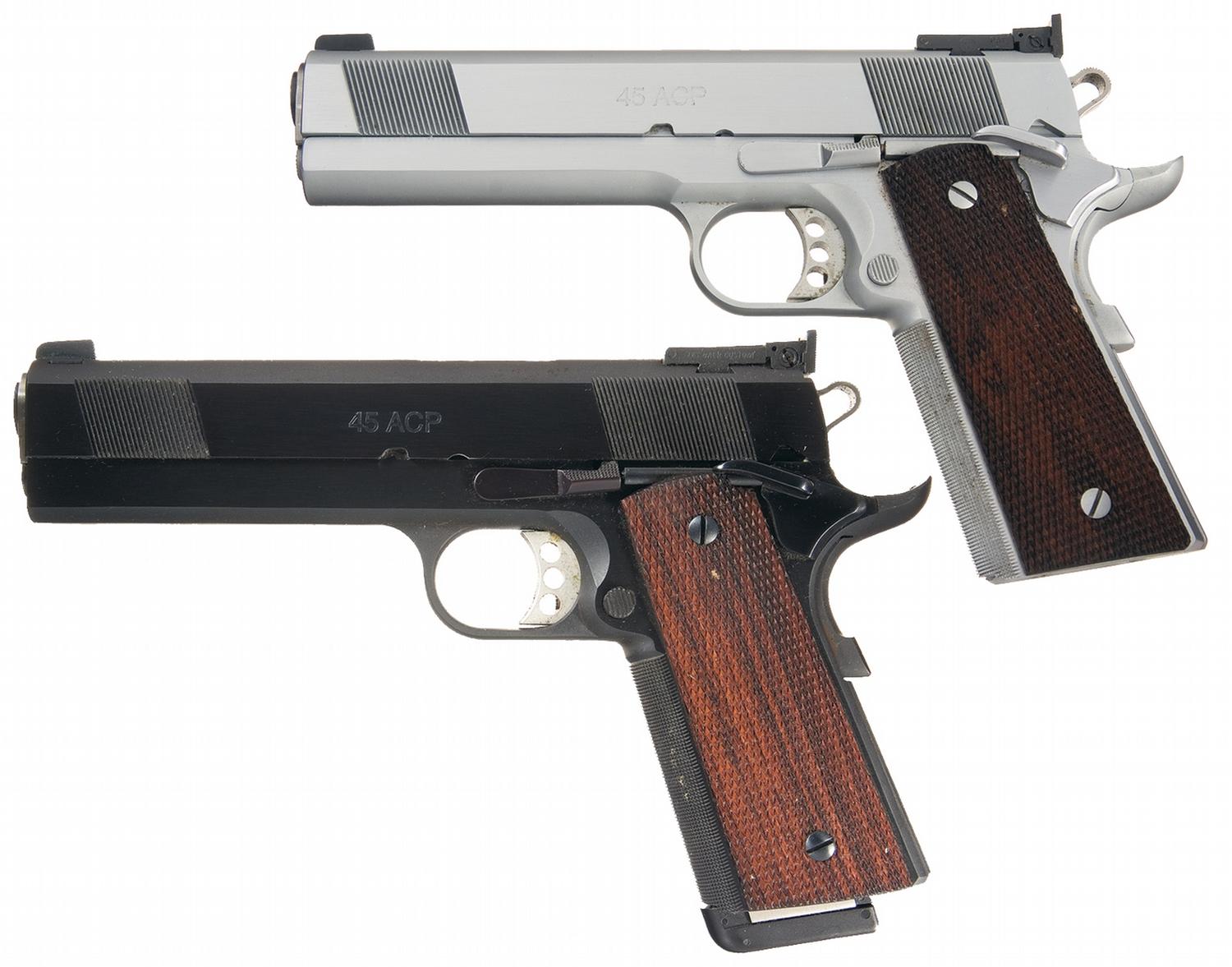 A) Features front and rear side serrations a lowered and flares ejection port and BoMar sights. Frame runs the length of the slide and features an ambidextrous thumb safety, a speed hammer, bevelled magazine well and a checkered front strap. Fitted with checkered rosewood grips. Complete with the original box numbered to the gun. In a Les Baer Custom hardwood case with "B".