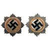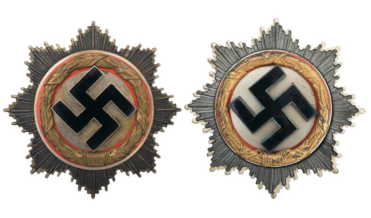 Introduced in 1941, the German Cross in Gold was the next valor award up from the Iron Cross First Class, given for repeated acts of battlefield bravery. While widely issued within the Wehrmacht and Waffen-SS to Germans, rewards to outsiders are believed to number less than 100. Each medal comes in a black leatherette case with white silk and black velvet inner lining. 1) German Cross in Gold, numbered "4" on the pin and inscribed "Lucien Lippert/20.02.44" on the back. Born in 1913 in Luxembourg, Lippert was an officer in the Belgian armed forces before taking over the 373. (Wallonische) Infanterie Battalion, a Belgian Walloon formation. The 373 would be transferred from the Heer to the Waffen-SS, becoming the 5th SS Volunteer Sturmbrigade Wallonien, which participated actively in combat on the Eastern Front. On the 13th of February, 1944, while performing rear guard duty for German forces attempting to escape the Korsun-Cherkassy Pocket, Lippert was killed in action. Following his demise, he was posthumously awarded the German Cross in Gold and promoted to SS-Obersturmbannfuehrer. The 5th Sturmbrigade would later be combined with the Spanish Blue Division and the Legion of French Volunteers Against Bolshevism to become the 28th SS Volunteer Grenadier Division Wallonien, which participated in multiple attempts to hold back the Soviet advance before finally escaping West to surrender to the British. 2) German Cross in Gold, numbered "1" on the pin, otherwise unmarked.