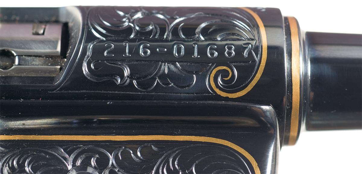 Standard markings and features, marked "40TH499" on frame, in commemorative case with belt buckle.