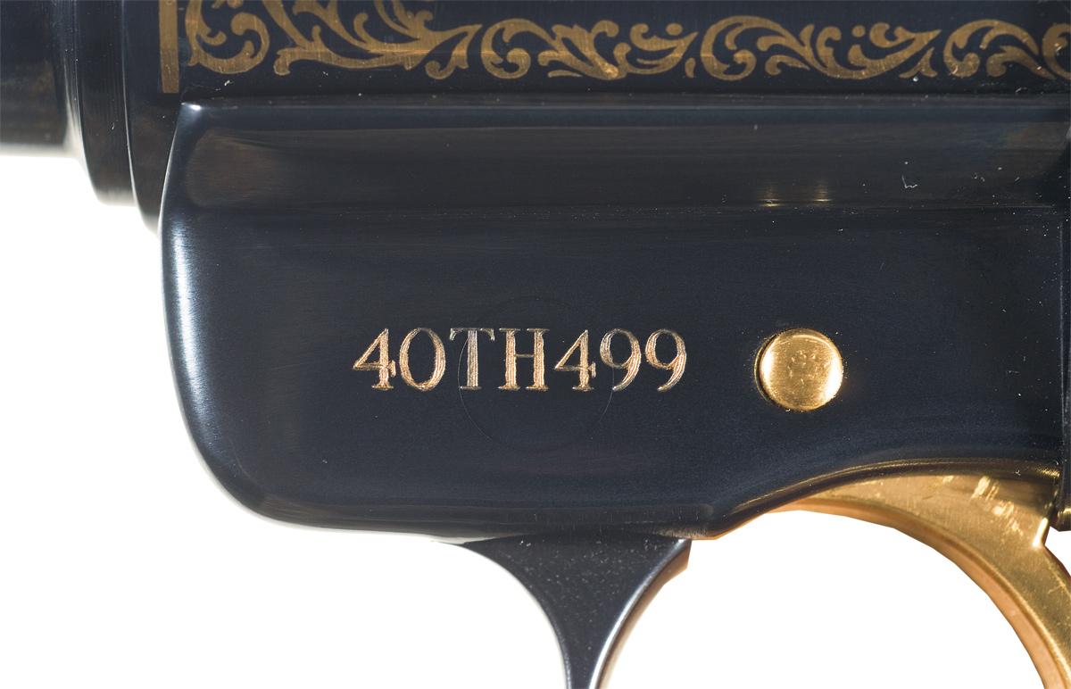 A) Standard markings and features, marked "9 of 40" on front grip strap, in commemorative case with belt buckle.