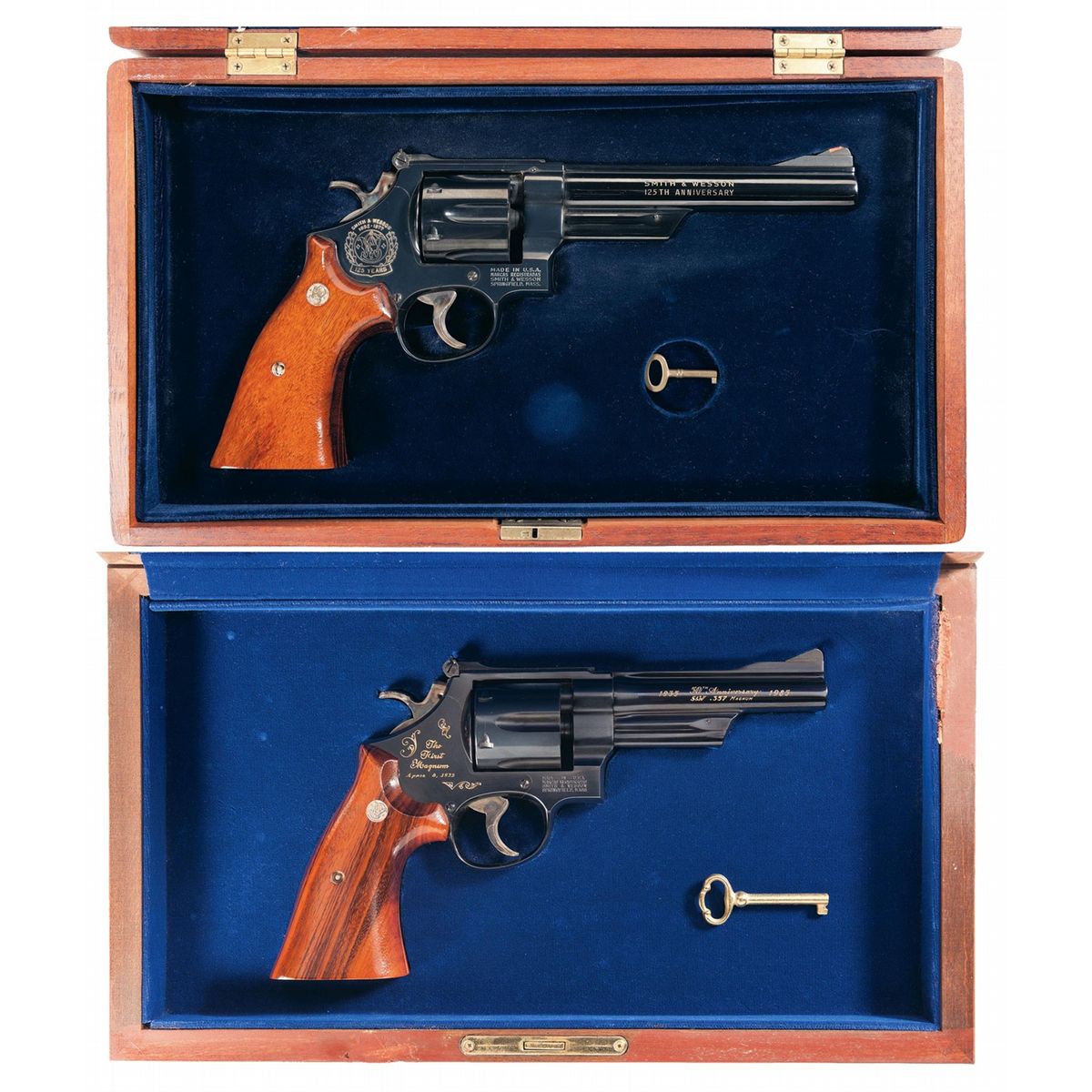 A) Standard markings and features. With hardwood case with plaque on the lid and book titled "125 YEARS WITH SMITH & WESSON".