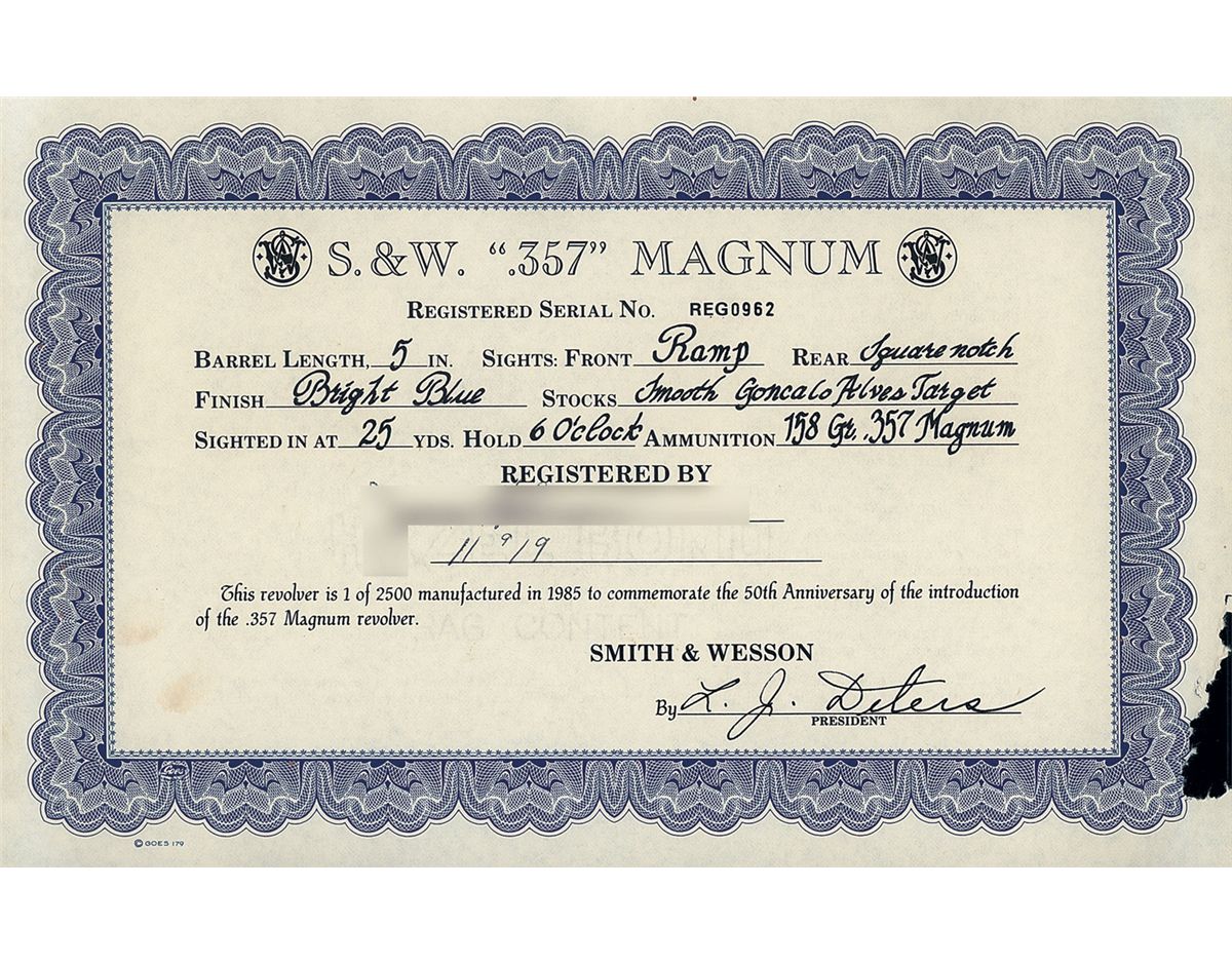 - B) Standard markings and features. With hardwood case with plaque on the lid, diagram sheet, cleaning supplies, a S&W pin and certificate of authenticity.