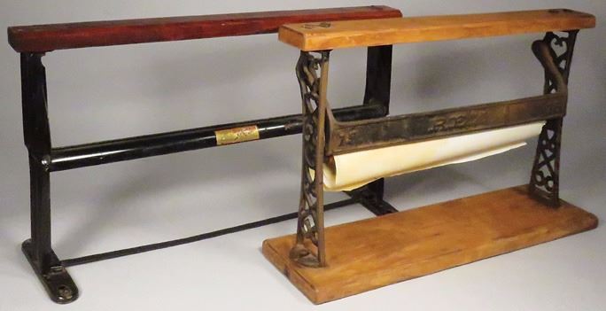Two Cast Iron Country Store Paper Dispensers and Cutters. REX 15, 19 1/2 X 13 X 5. Bulman Spring Paper Cutter, 21 1/2 X 12 X 9 inches. Both in good original condition.