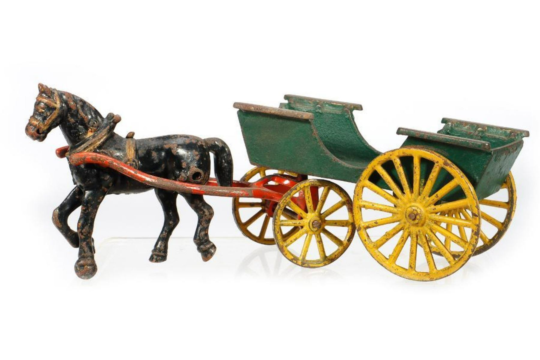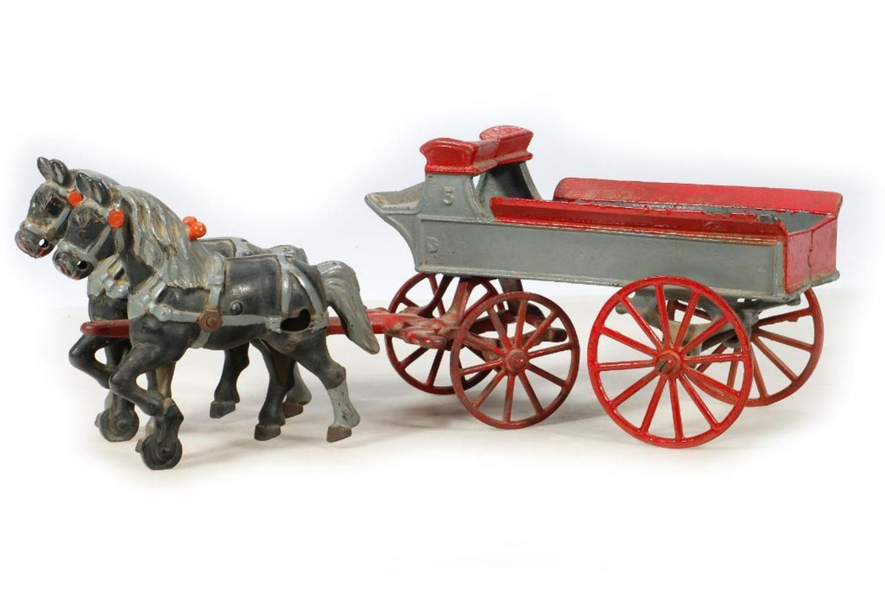 Wagon 1 has one horse and assembly is about 12 inches long. Wagon 2 has two horses and assembly is about 18 inches long. They are dusty from storage and worn from use.