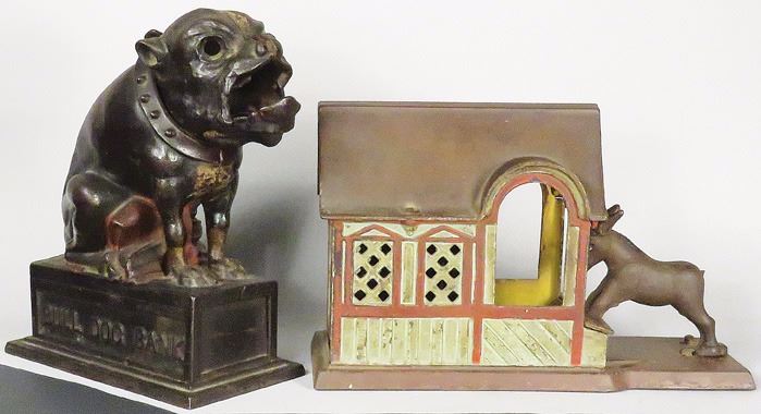 Two J.E. Stevens 1880's Cast Iron Mechanical Banks. Bull Dog sitting on red carpet, tail broken. Mule Entering Barn, rust with broken tail, no coin trap, 8 1/2 inches long.
