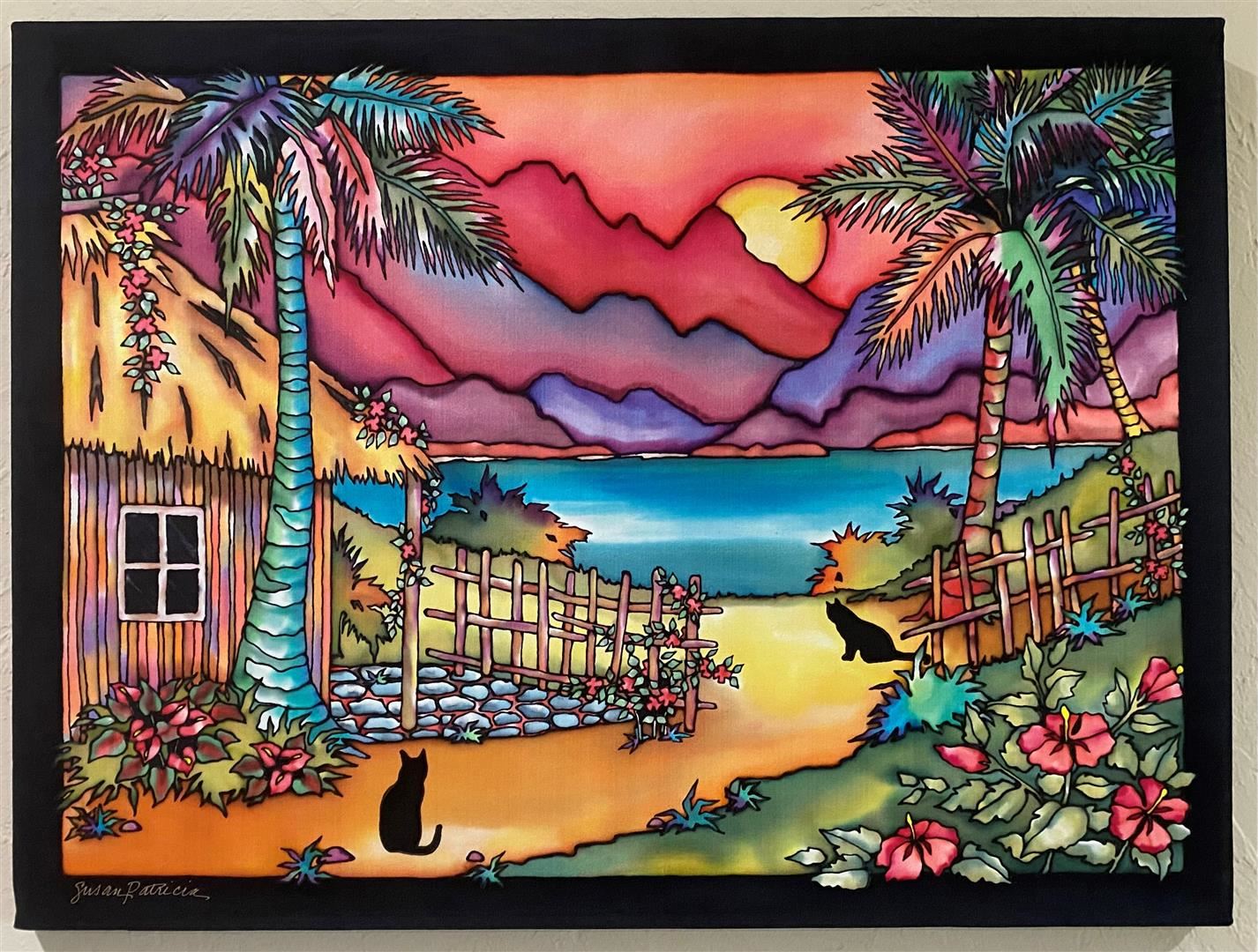 In stunning color Susan Patricia catches a Hawaiian sunset while two black cats look on. Original on silk 24x18"