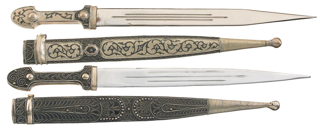 1) Caucasian style dagger, 13" spear point blade with triple fullers on one side and double fullers on the reverse. German silver sheath, with silver inlays, twisted wire overlays, and zig-zag engraving. OAL: 17 3/4". With sheath, decorated to match the hilt, with a wire wrap near the tip and floral designs. 2) Caucasian style dagger, 12 3/4" triple fuller blade, with wire decorated silver hilt and sheath, the latter with a wire wrap like #1. OAL: 17 3/4".