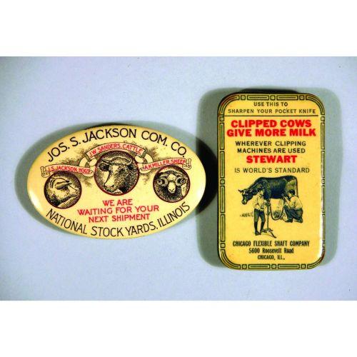 Two Celluloid Knife Sharpening Stones including Jos. S. Jackson, National Stockyards, Illinois and Stewart Hair Clipping Machines for Cows, Chicago Flexible Shaft Company. Excellent condition. 2 3/4 X 1 3/4 inches.