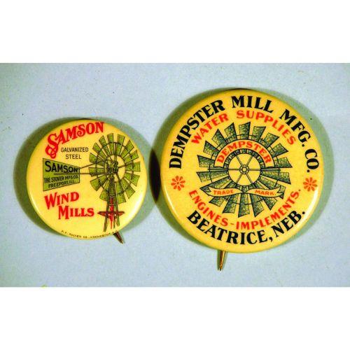 Two Celluloid Pinbacks including a Sampson Wind Mills and Dempster Wind Mills, Dempster Mill Mfg. Co. Beatrice, NB. Excellent condition. 1 1/4 and 1 3/4 inch diameters.