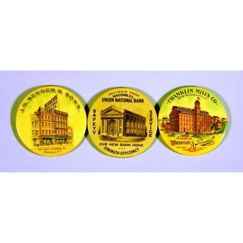 Three Celluloid Pocket Mirrors including Seegers Furniture-Buffalo, NY, Union National Bank-Macomb, IL and Franklin Mills, Lockport, NY. Excellent condition. 2 inch diameter.