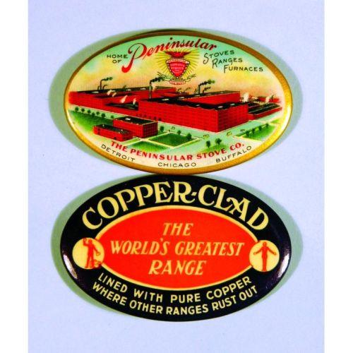 Two Celluloid Pocket Mirrors including for Peninsula Stoves Ranges and Furnaces and Copper clad Ranges. Excellent condition. 2 3/4 X 1 3/4 inches.