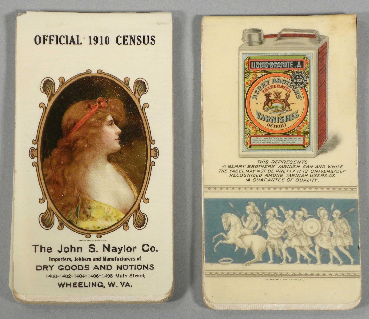 Lot of Two Celluloid Pocket Note Pads including Official 1910 Census. The Hohn S. Naylor Co. Dry Good and Notions, Wheeling, WV. Book written in and top spine separating otherwise very good condition. Liquid Granite and Architectural Finishes. Berry Brothers, Varnishes, Detroit. Slight staining on back cover otherwise excellent condition. 2 1/2 X 4 1/2 inches. Start Price $30