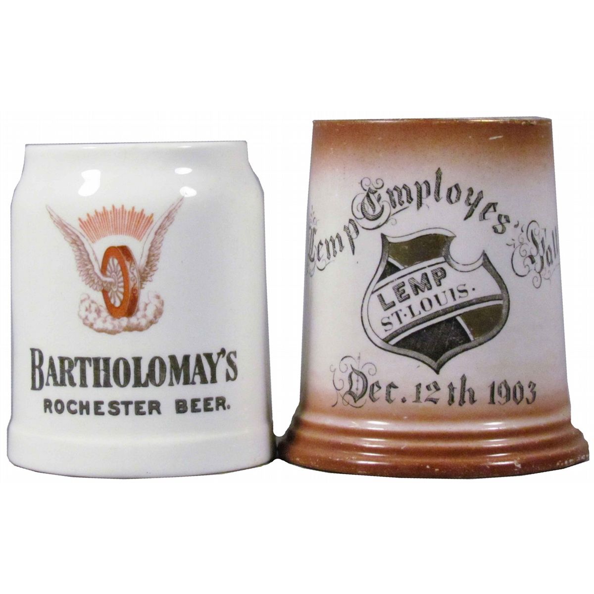 Two Ceramic Beer Mugs. Lemp Employee's' Hall, Dec. 12, 1903 and Bartholomay's Rochester Beer. Both have normal crazing otherwise very good condition. Tallest measures 4 1/4 inches tall.