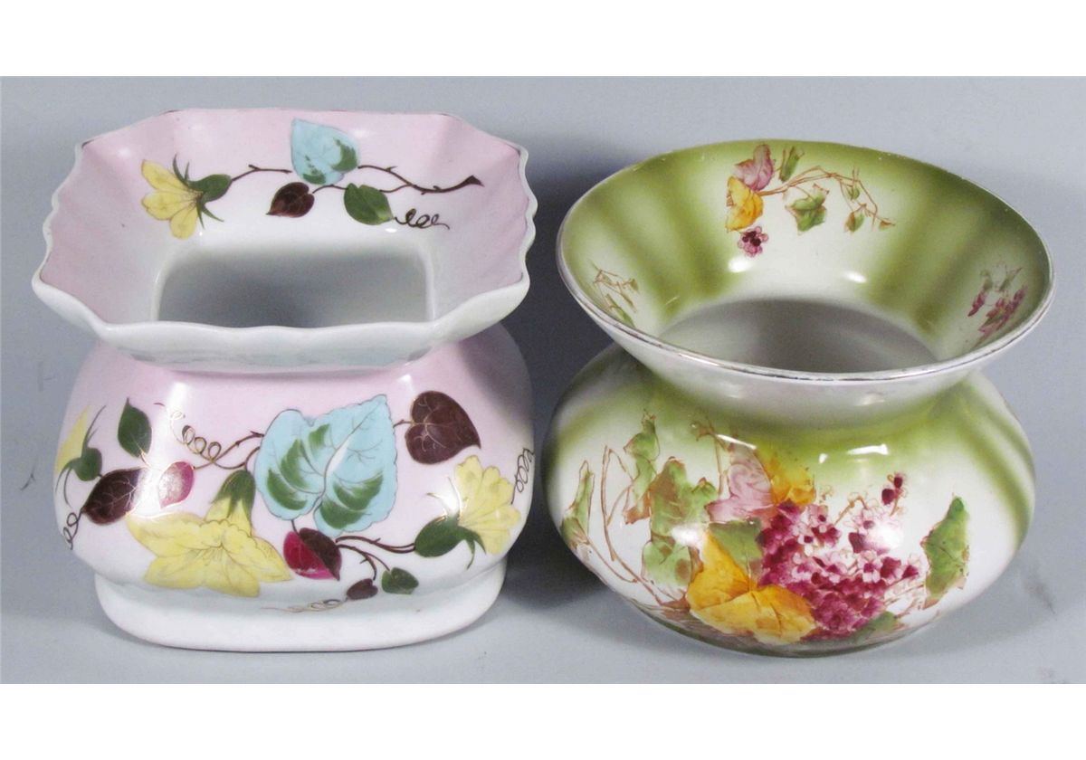 Two Ceramic Spittoons. Green with vines, marked Homer Laughlin. White with hand painted morning glory. Large one measure 7 inch diameter X 6 inches tall.