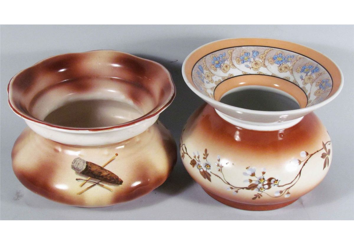 Two Ceramic Spittoons. Brown with smoking motif around sides, anchor on bottom. Brown hand painted with white floral motif. Smoking motif measures 8 inch diameter X 5 inches tall.