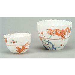 Two Chelsea fluted bowls, painted in the Kakiemon manner and after a Meissen original with a red tiger, a red dragon and flowering prunus, 5cm & 8cm high, circa 1752 (the smaller has a hairline crack, each with a rim chip