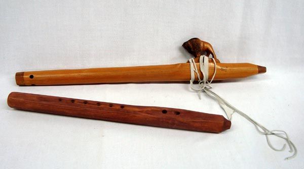 Two Cheyenne Wood Flutes. Two hand made flutes with animal carvings over the mouthpiece hole. The longest is 20'' long and has a bear figure.