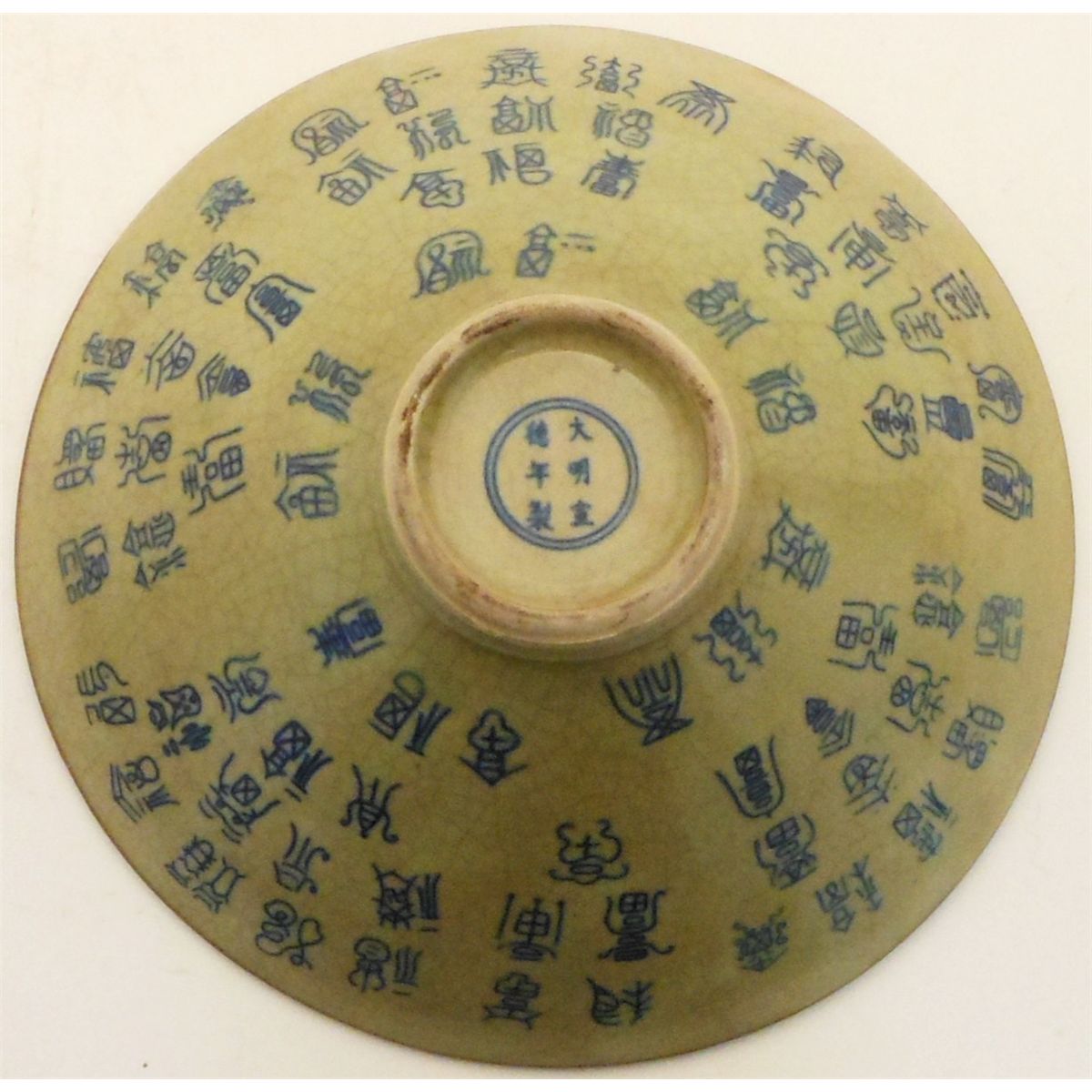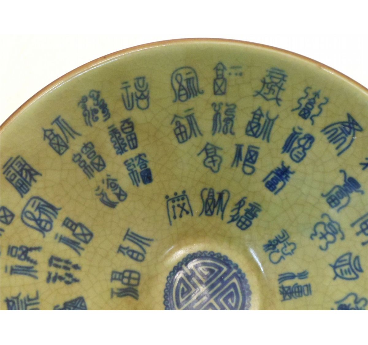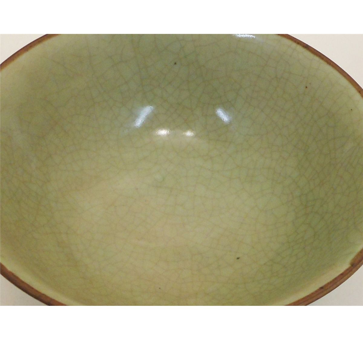 3" tall x 7 1/2" diameter celadon colored crackle bowl with a brown rim, six character marking. 2 3/4" tall x 8" diameter celadon colored crackle with brown rim decorated inside and out with symbols and a centered cartouche, six character markings. Both in great condition.
