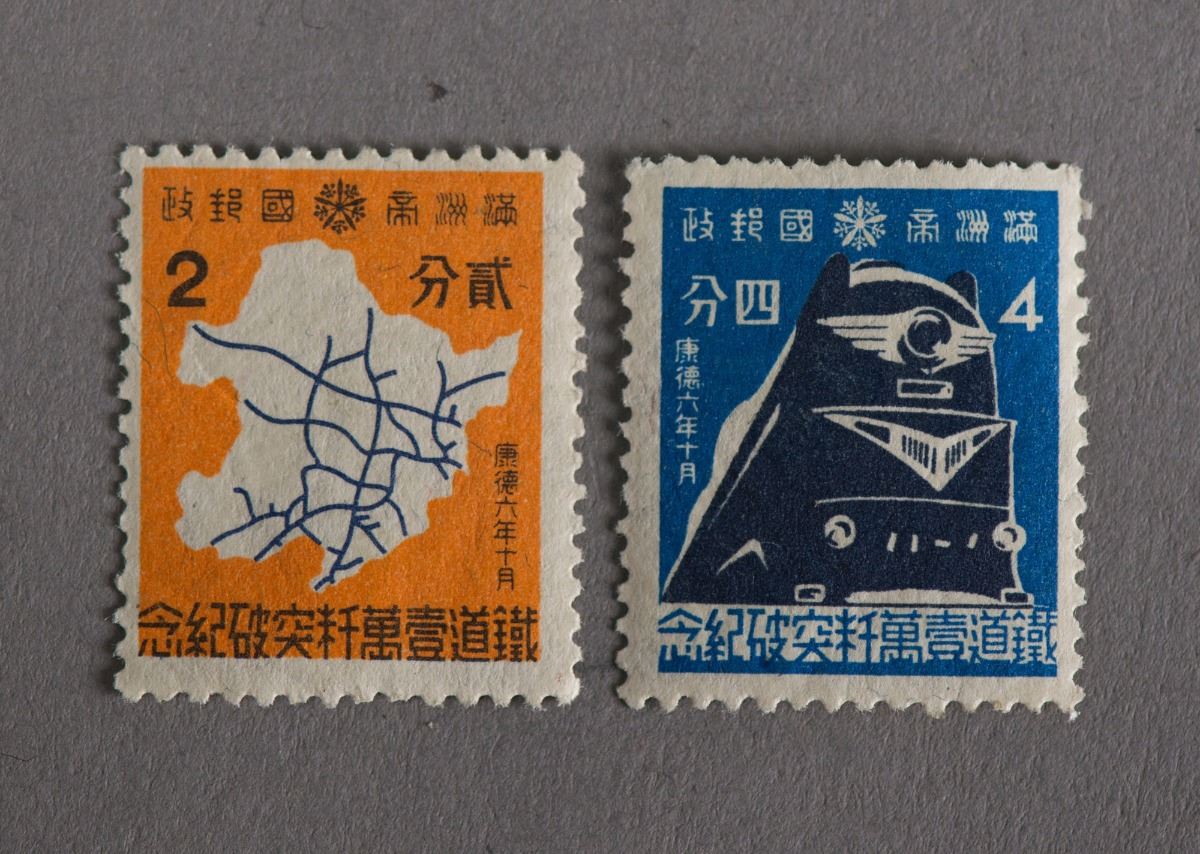 One "2 cents" and one "4 cents" Chinese stamps, Man C.9 Completion of 10,000 Km of Railways, 1939.10.21; 18.5 mm x 22.5 mm; Provenance: private Canadian collector