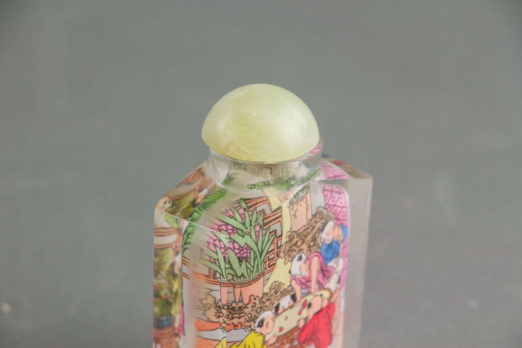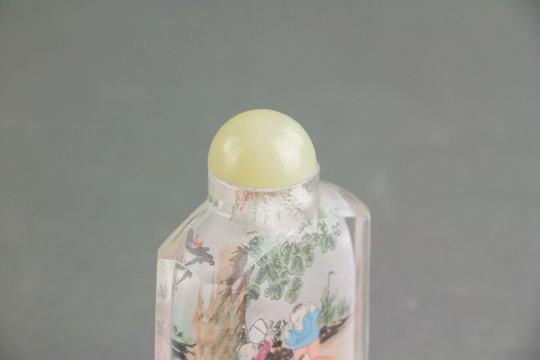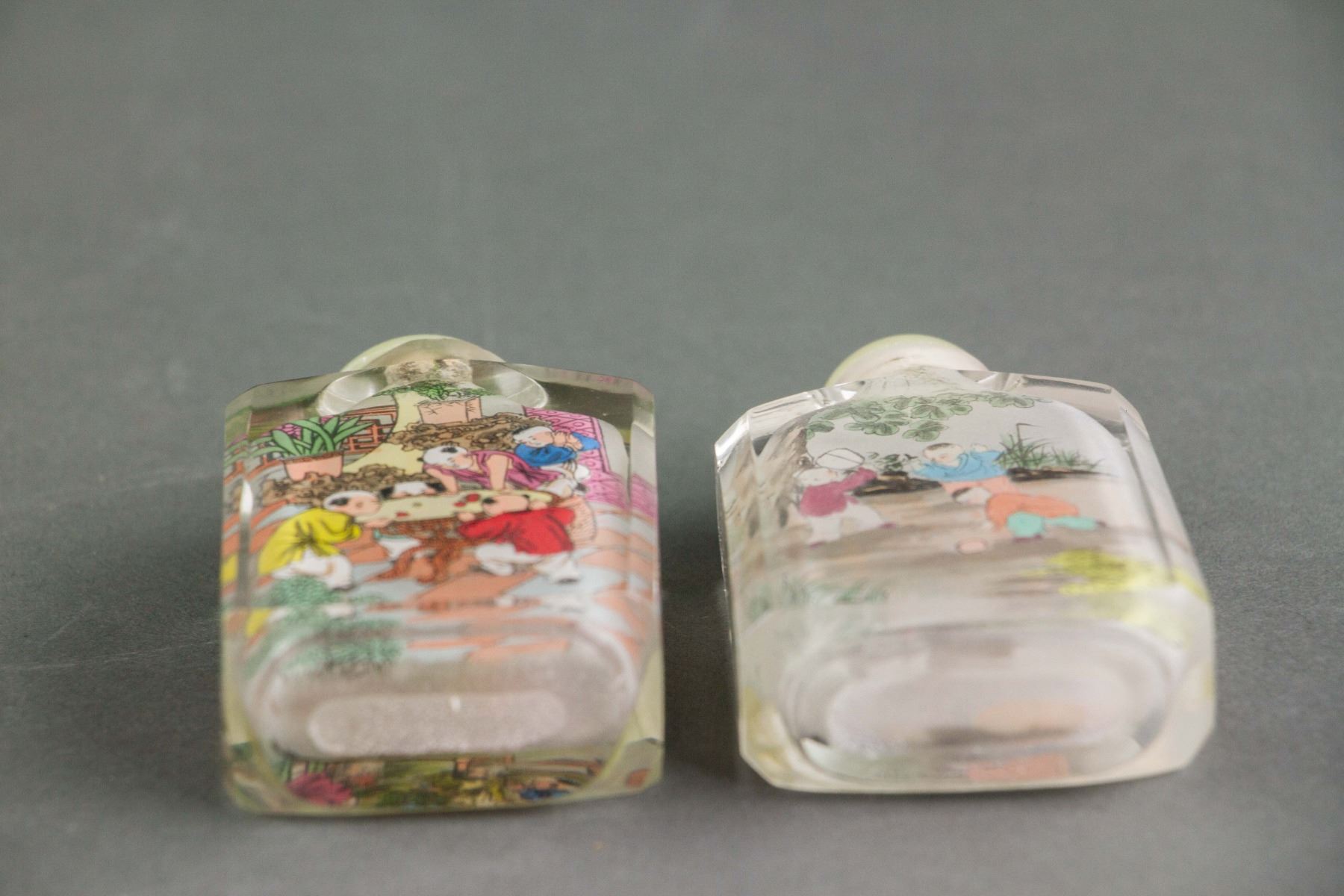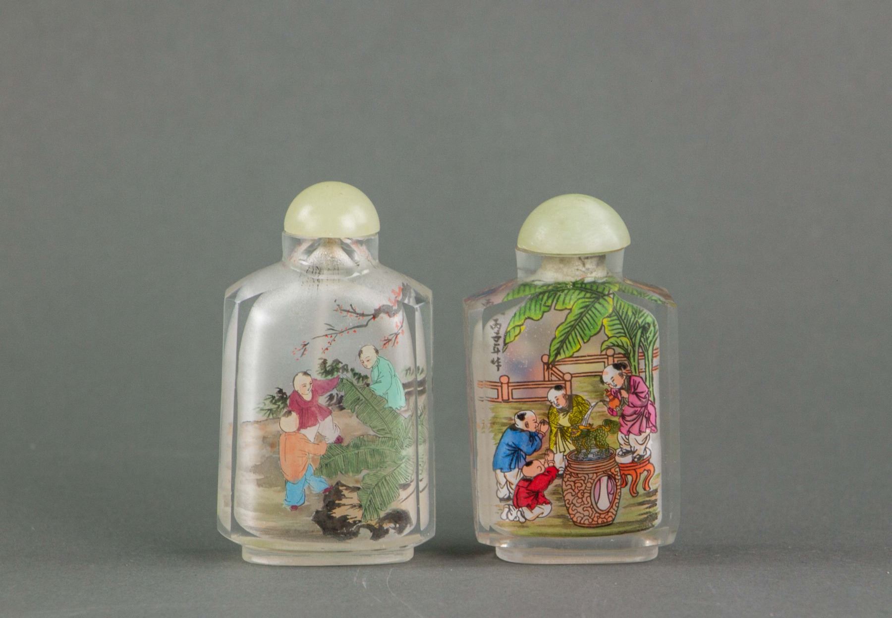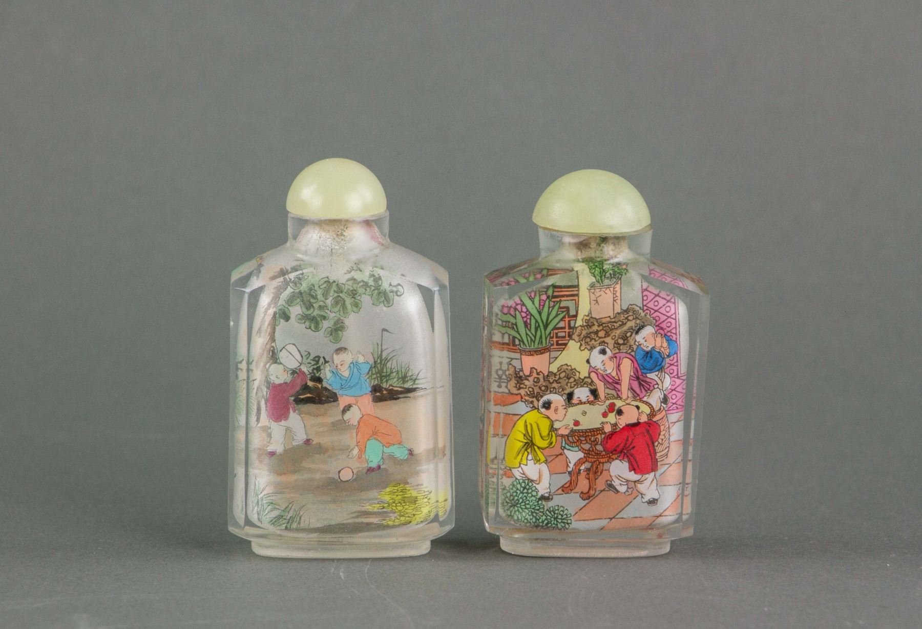 Two (2) Chinese glass snuff bottle; of flatten rectangle body; supported on short foot rim; painted inside with children playing scene; 9 cm x 4 cm, 243 grams (both)