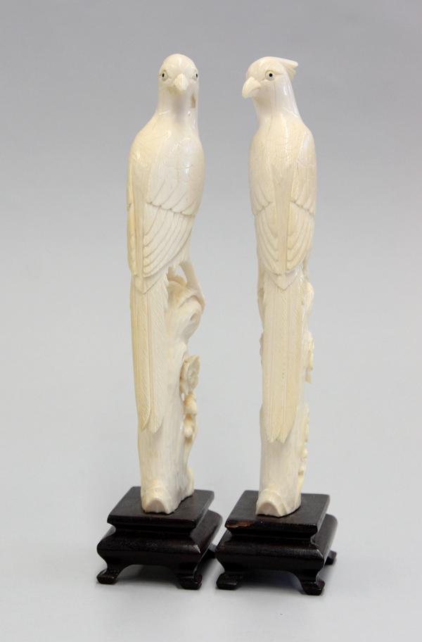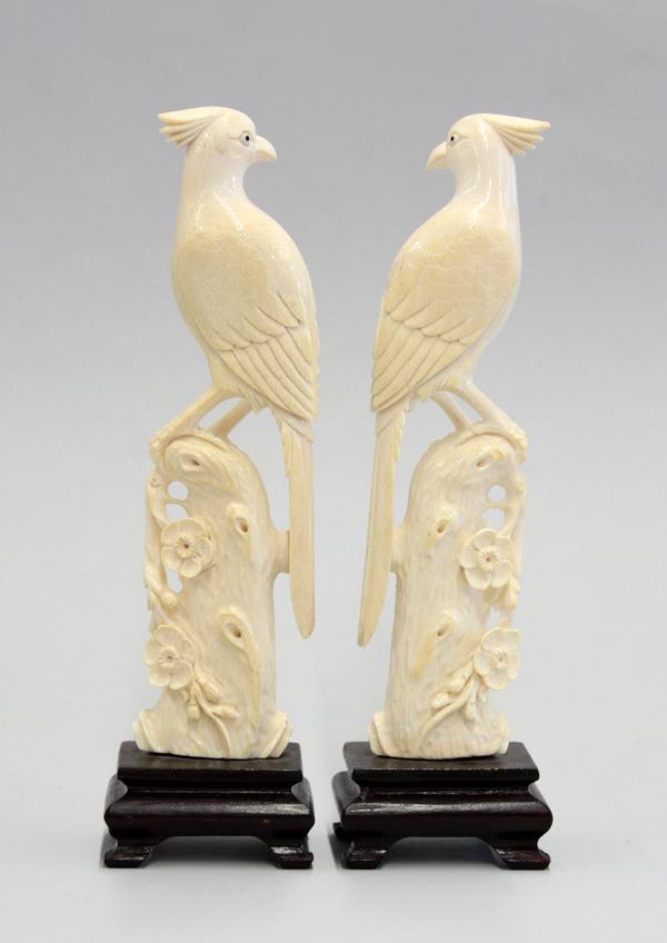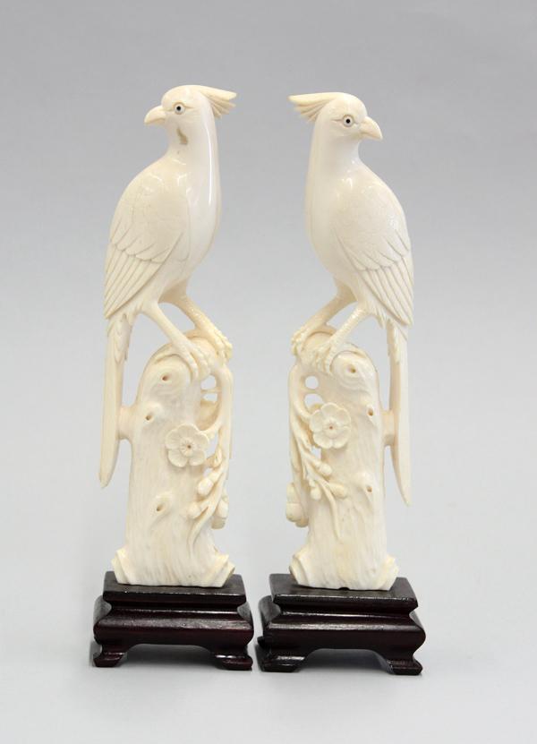 Pair of Chinese ivory birds, each sculpted as a crested long tail bird perched on a gnarled branch accented by flowering prunus (hairline cracks), ivory: 6.25''h; each adhered to wooden stands