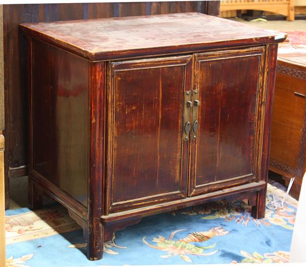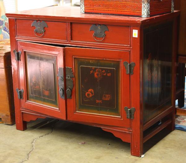 (lot of 2) Chinese lacquered side cabinets, the first with a pair of hinged doors, opening to a set of two drawers over an open compartment, all raised on beaded supports framed by a shaped apron; the second, with pigment decorated door panels and side panels featuring scholars items along with bird and flowers reserves on a black ground, all contrasted with the red top placed above a set of two drawers heightened with bat form pulls, 35''h