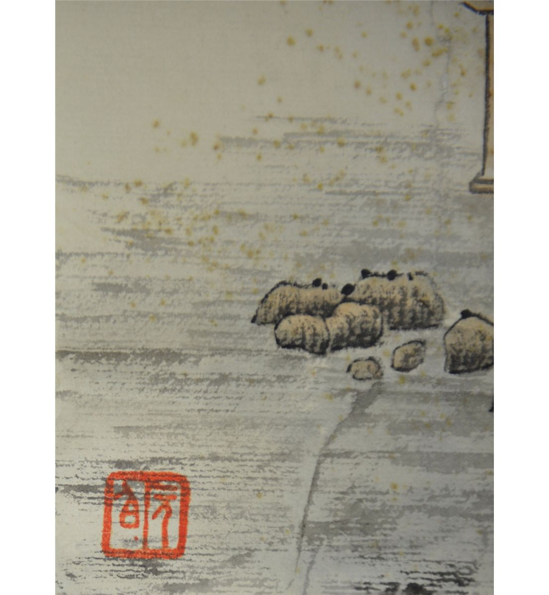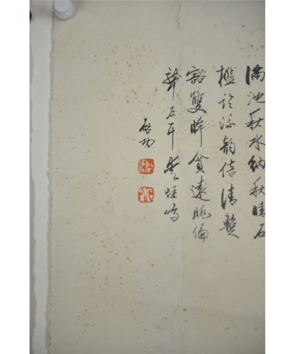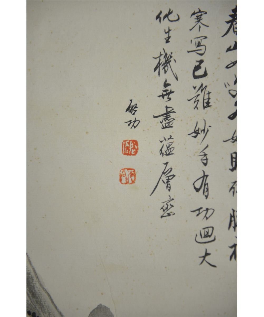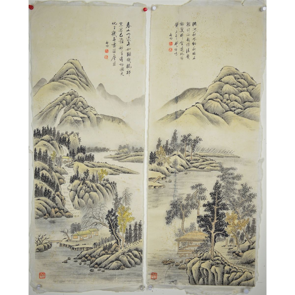 A series of two landscape watercolor paintings on paper with script calligraphy and artist seals; signed Qigong (1912-2005) Condition Report: fraying of the paper around all the edges. H: 65 cm, W: 26 cm each.