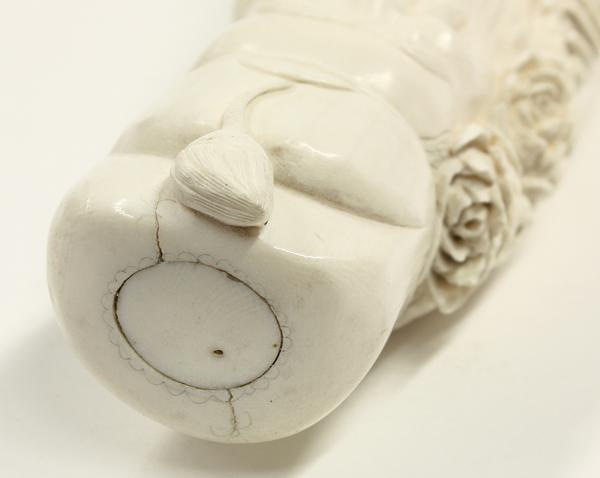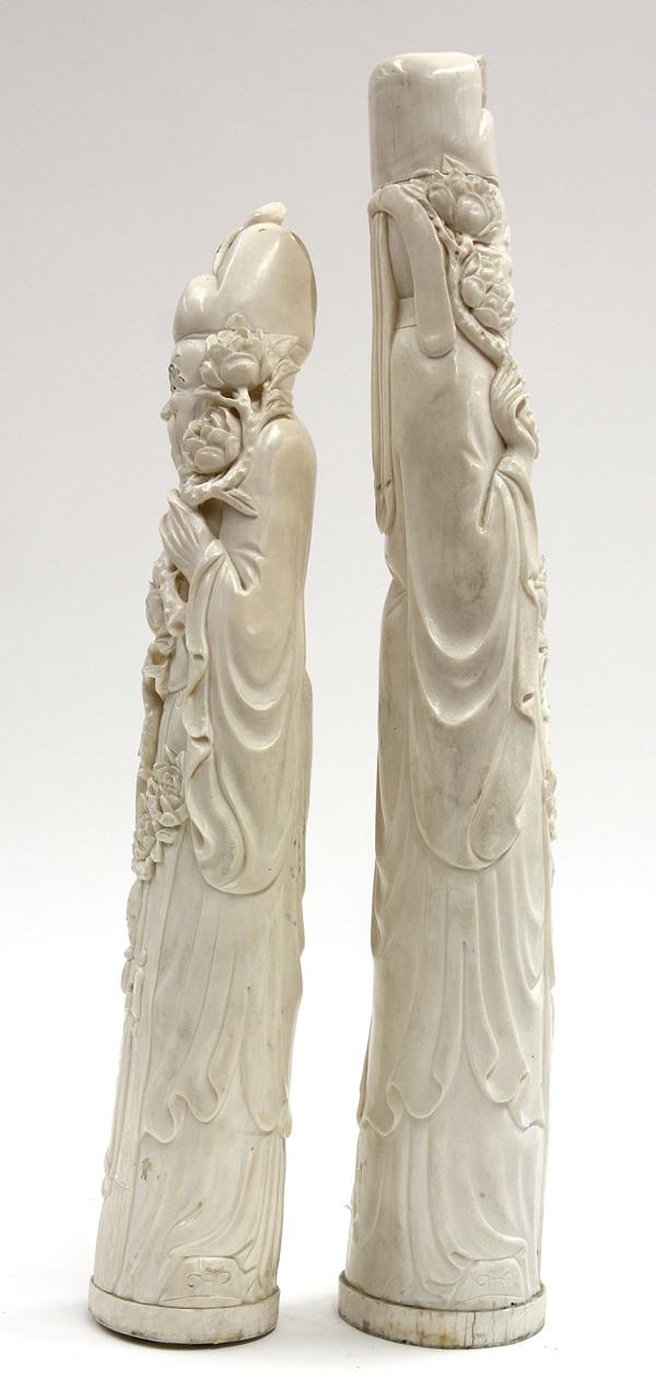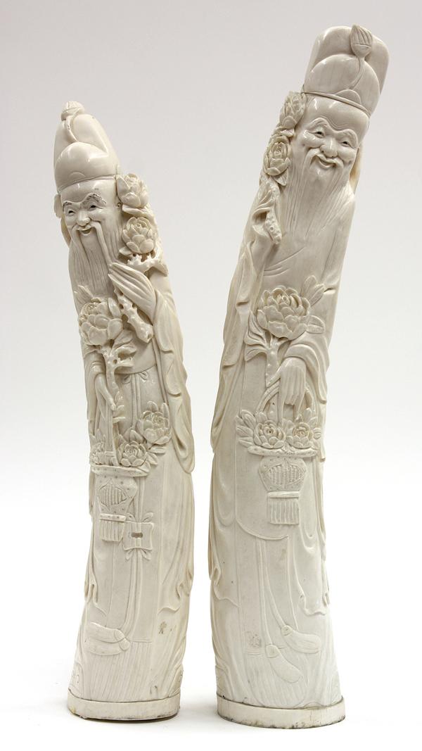 (Lot of 2) Chinese large ivory figures of Chinese elders, each standing figure retaining the curve of the original tusk, the long robes secured by a tasseled belt and one hand holding a flower basket overflowing with peony blossoms, another spray held to one side of the smiling bearded face framed by a scholar's cap, 18'' and 15.75''h
