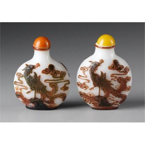 <B>Two Chinese Snuff Bottles<BR></B></I><BR>Two Chinese carved two color overlay glass snuff bottles on white ground; red and dark green dragon and phoenix; black and red dragon and phoenix<BR>3in. high<BR><BR> <B>Condition Report:</B> Normal signs of wear as appropriate with age.<BR><BR><b>Shipping:</b> Bottles, Jars & Containers (<a target="_blank" href="http://www.heritageauctions.com/common/shipping.php">view shipping information</a>)