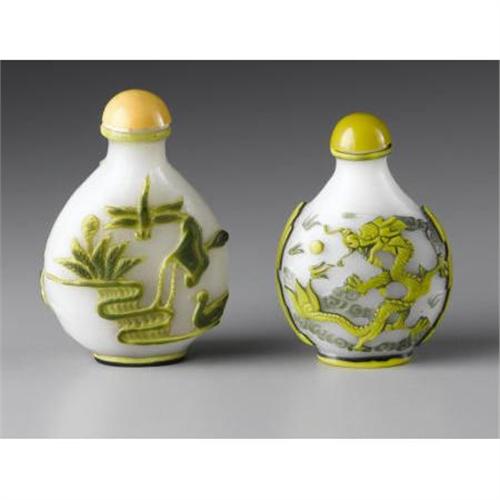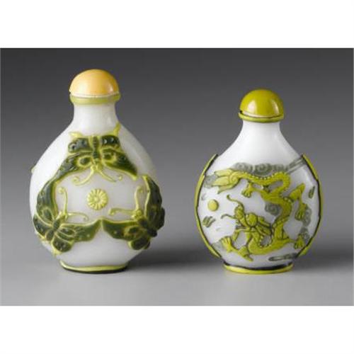 <B>Two Chinese Snuff Bottles<BR></B></I><BR>Two Chinese carved two color overlay glass snuff bottles on white ground; green and yellow butterflies and water plants; together with green and yellow dragons and pearls<BR>3in. high<BR><BR> <B>Condition Report:</B> Normal signs of wear as appropriate with age.<BR><BR><b>Shipping:</b> Bottles, Jars & Containers (<a target="_blank" href="http://www.heritageauctions.com/common/shipping.php">view shipping information</a>)