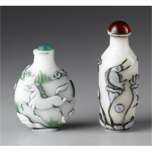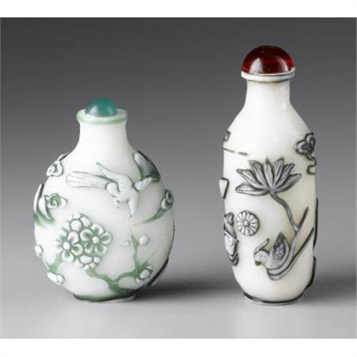<B>Two Chinese Snuff Bottles<BR></B></I><BR>Two Chinese two color overlay glass snuff bottles on white ground; white and green horse and foliage; white and dark green water plants and animals<BR>2-3/4in. and 3-3/8in. high<BR><BR> <B>Condition Report:</B> Normal signs of wear as appropriate with age.<BR><BR><b>Shipping:</b> Bottles, Jars & Containers (<a target="_blank" href="http://www.heritageauctions.com/common/shipping.php">view shipping information</a>)
