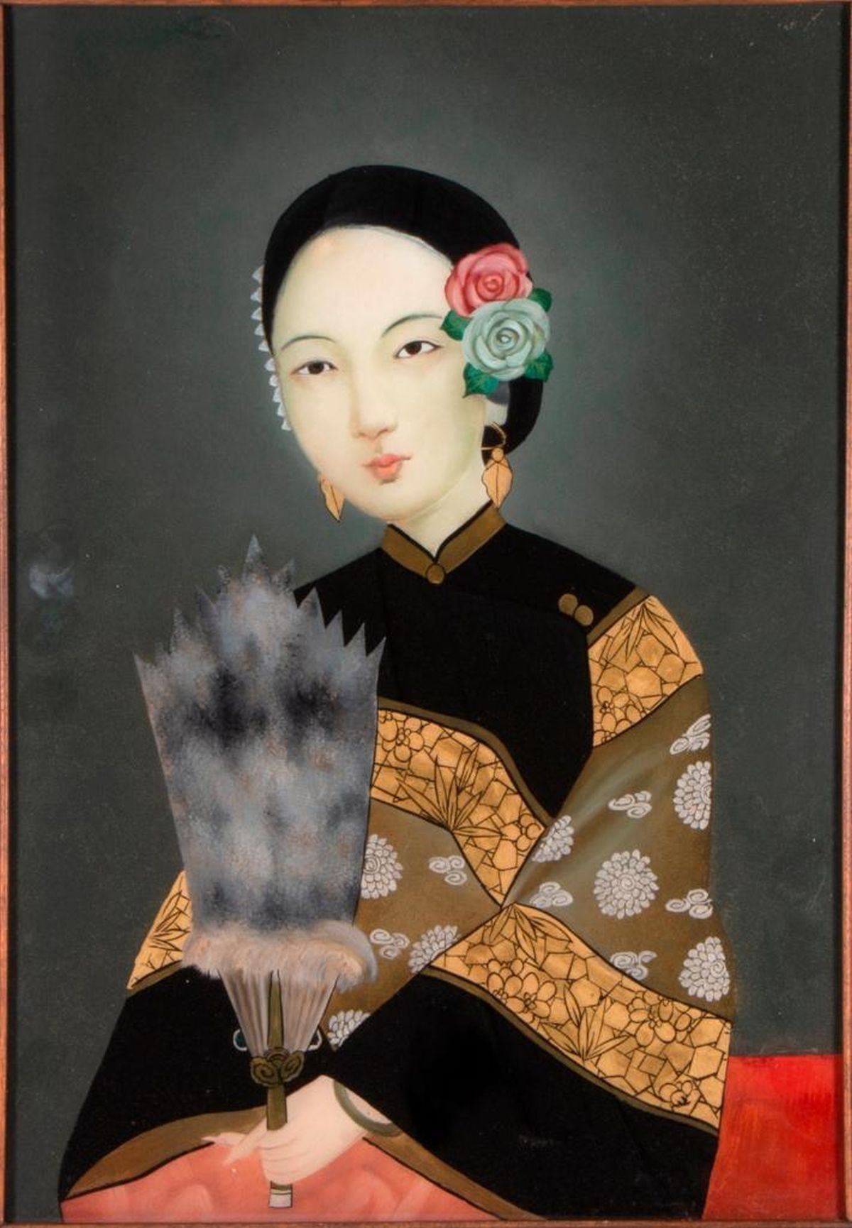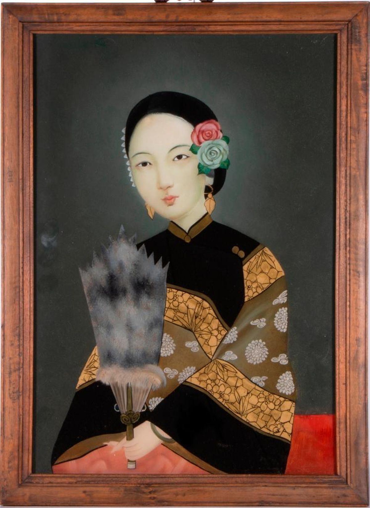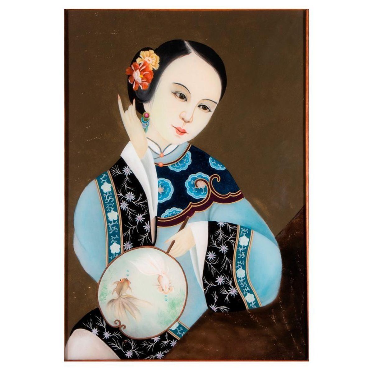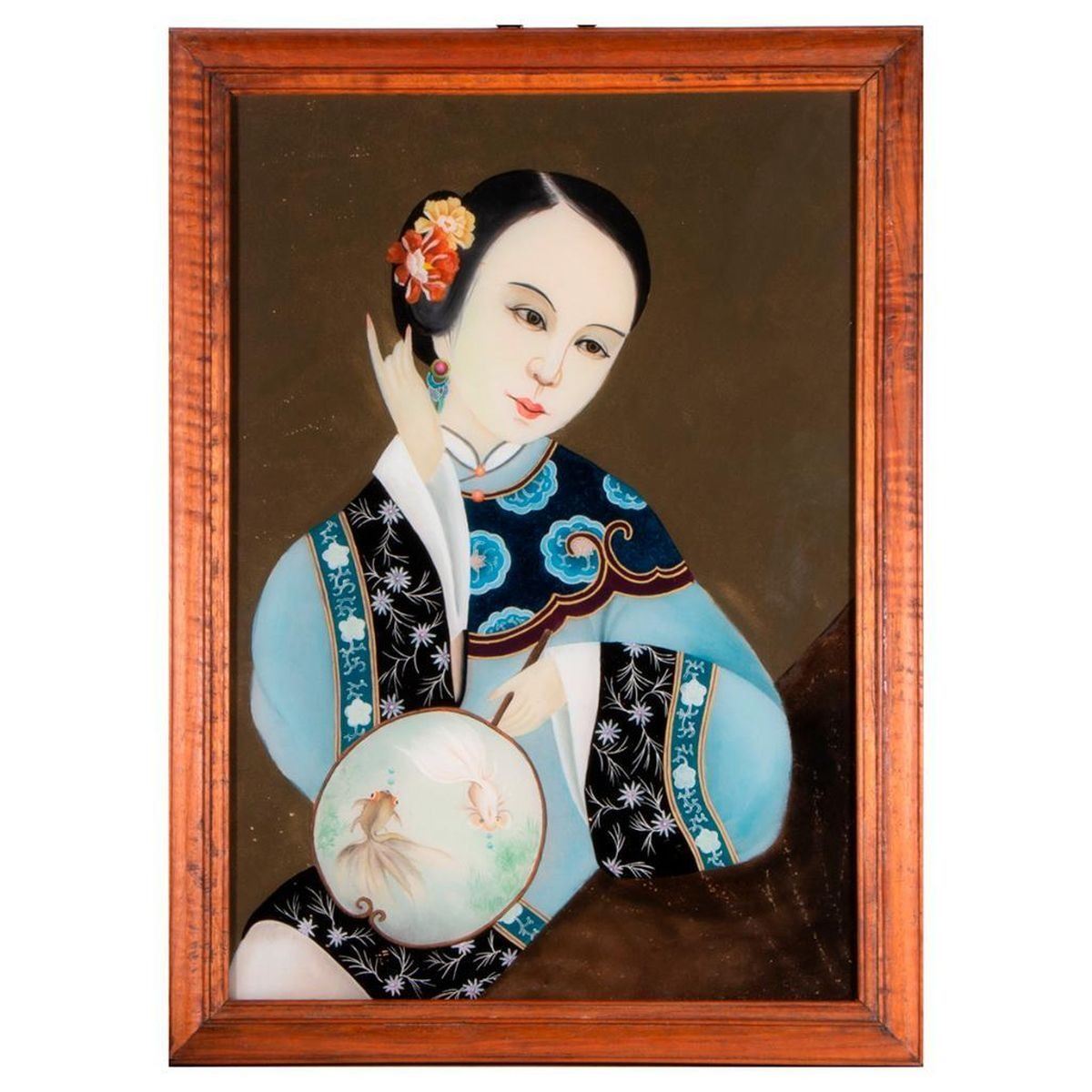 A pair of late 19th / early 20th century Chinese reverse painted glass portraits of maidens measuring each 22 1/2 inches high x 16 1/2.